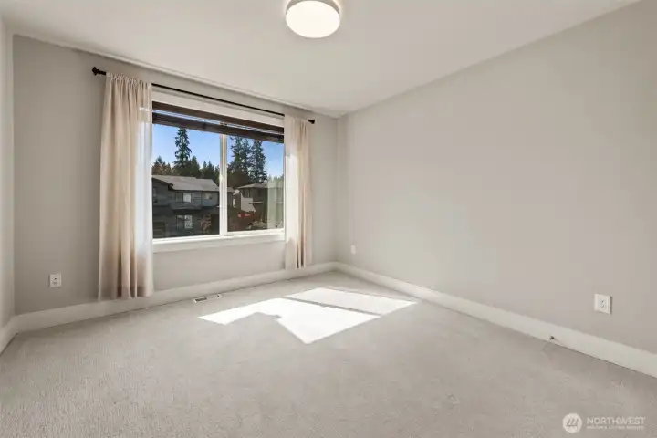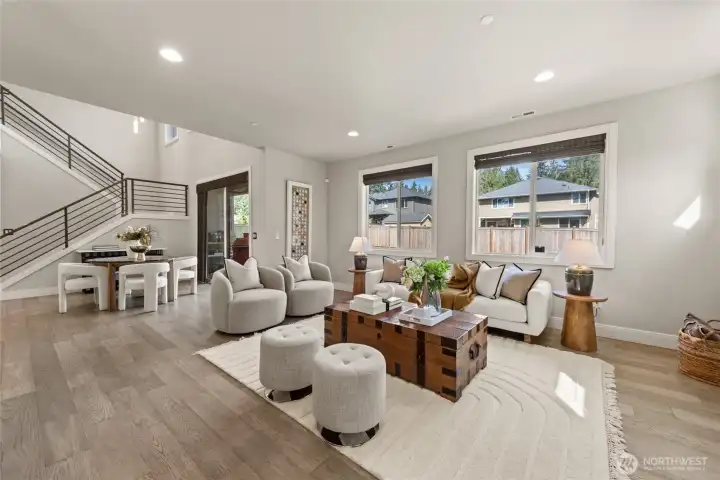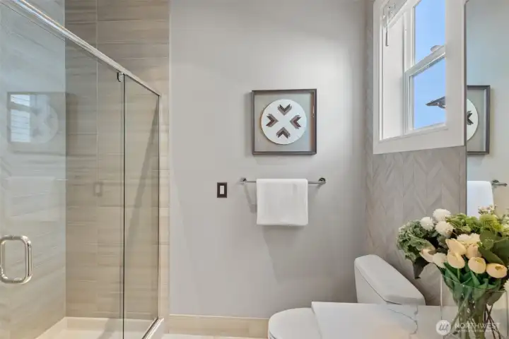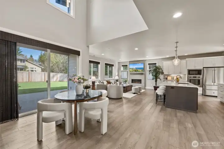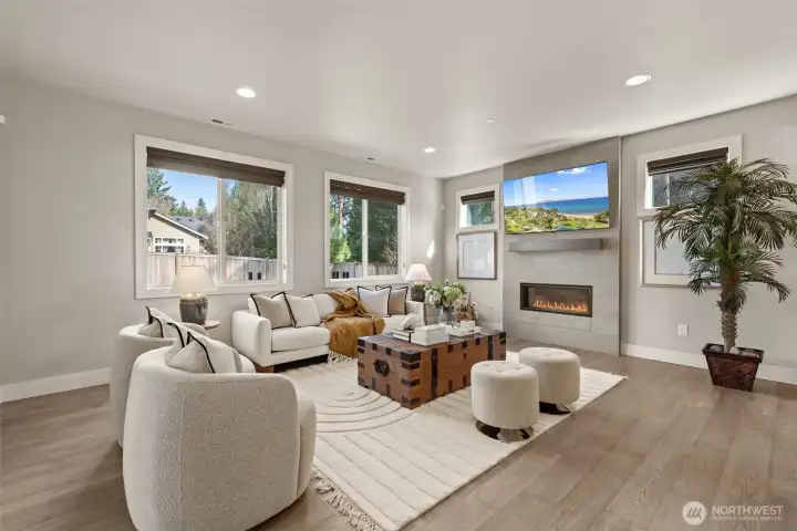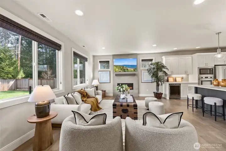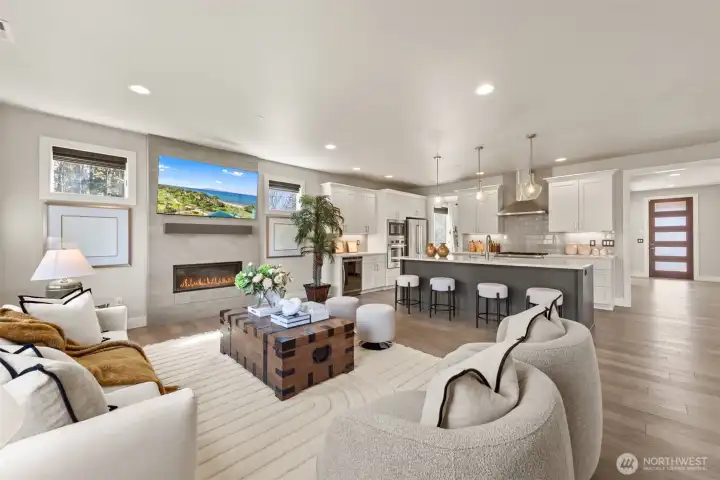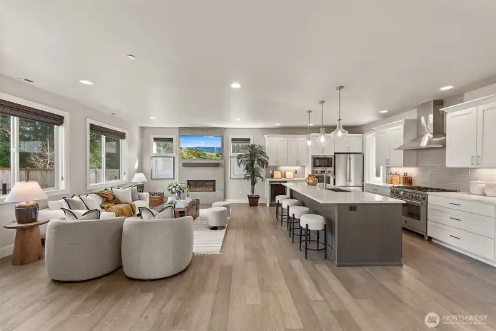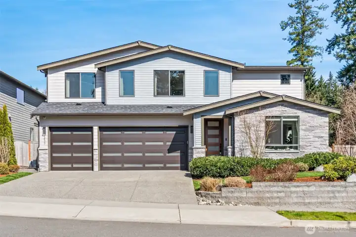 2019 built NW Contemporary on a quiet, south facing Bothell culdesac with year round natural light. Northshore feeders Shelton View Elem, Canyon Park Middle, Bothell HS NO HOAWide-plank hardwoods span the main level. Kitchen: slab quartz, full-height tile backsplash, walk-in pantry, Bertazzonistainless suite with dual ovens — gas range plus electric wall oven. Vaulted great room with gas fireplace opens tocovered patio via French doors. Main floor bedroom with adjacent 3/4 bath (walkin shower) ideal for in laws,guests, or home office.Upstairs: vaulted primary with 5-piece bath (freestanding tub, walk-in shower, quartz, walk-in closet), three bedrooms+ bonus/media room.Outdoors: covered patio + custom paver patio, level fully fenced yard with territorial views, full-lot irrigation, new sod.Systems: central A/C (American Standard, 2019), 90%+ furnace, tankless, Tesla Level 2 EV charger, smarthome wired,SimpliSafe + hardwired Lorex 4camera security.Commute: 5 min to I405 or I5 direct access to Seattle, Bellevue, Redmond, and Kirkland tech hubs (great for dual commute households). Canyon Park tech corridor 8 min; HMart and 99 Ranch within 10.Conveys: wall-mounted 77" + 66" LG OLEDs, premium wood blinds throughout, Bertazzoni appliance