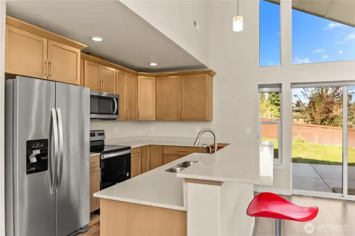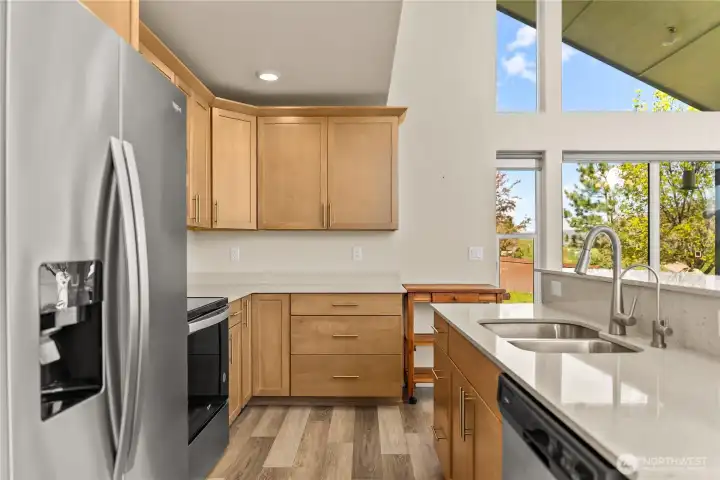 Bright natural light, clean lines and large island allows the chef to host dinner guests.