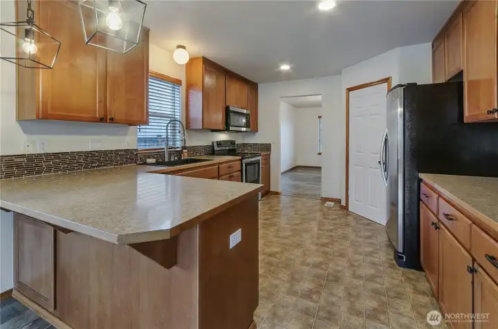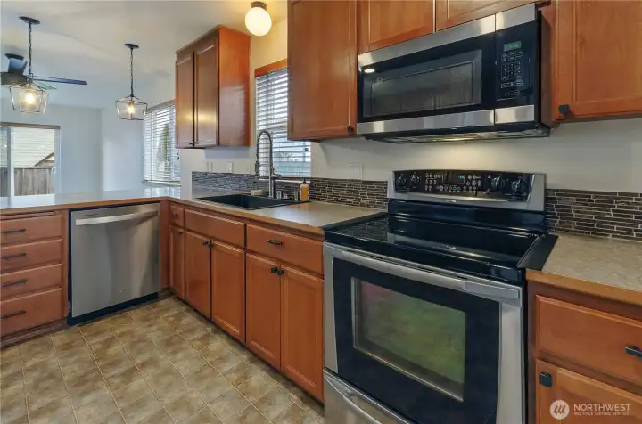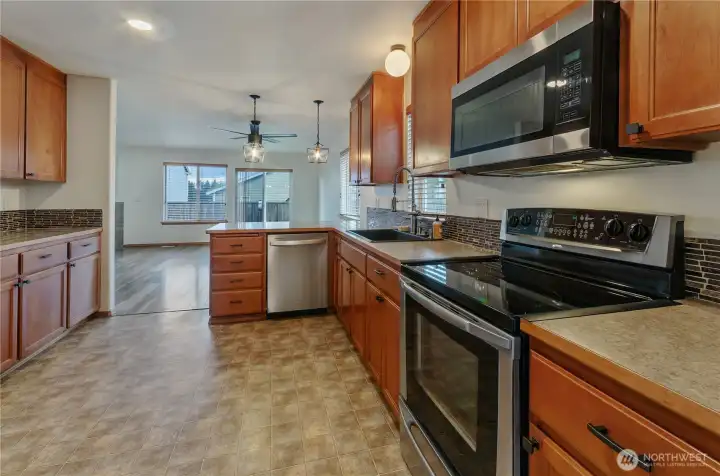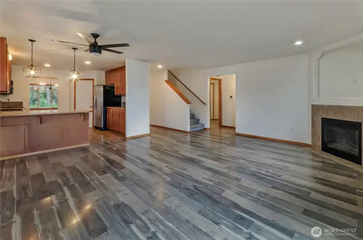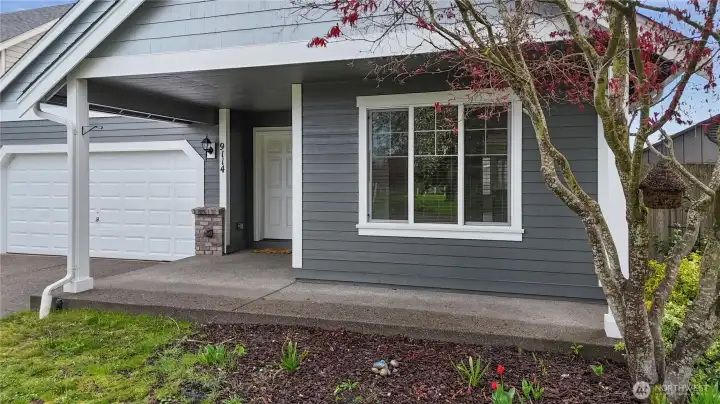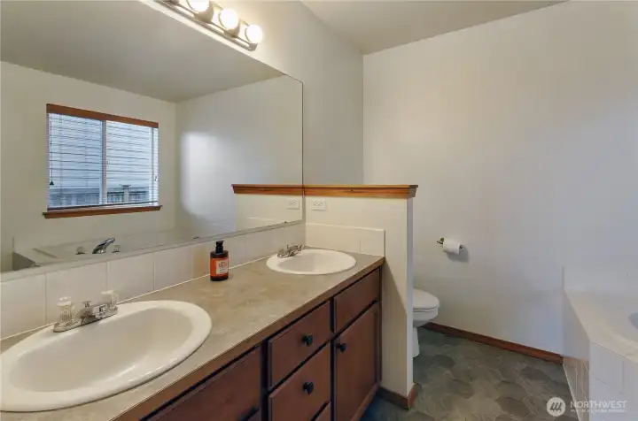 Welcome to this beautifully maintained home in the desirable Mountain Shadow community, offering more than 2600 sqft of space, comfort & thoughtful updates throughout. Designed w/ versatility in mind, this 5-bedroom home plus dedicated office provides room for everyone. Main floor features a spacious primary suite complete w/ a luxurious 5-piece en suite, including a soaking tub, double vanity, & walk-in closet. A formal dining room greets you at the entry. The inviting living room w/ gas fireplace flows seamlessly into the expansive kitchen; equipped w/ stainless steel appliances, abundant cabinetry, pantry, & generous breakfast bar perfect for gathering. Upstairs, you’ll find 4 additional bedrooms w/ walk-in closets and charming corner windows, a full bath, and a dedicated office space ideal for remote work or study. At the top of the stair landing, enjoy a delightful peek-a-boo view of Mt. Rainier from the bonus area. Recent updates include newer carpet, modern light fixtures, a remodeled main-floor half bath, & NEW PAINT on exterior Sept 2025. Comfort is ensured year-round w/ central A/C. Additional highlights include a conveniently located laundry room near the primary suite, wood slat blinds throughout, & 2-car attached garage. Step outside to a fully fenced, low-maintenance backyard; perfect for relaxing or entertaining. Professionally cleaned & truly move-in ready, this home is an exceptional opportunity you won’t want to miss.