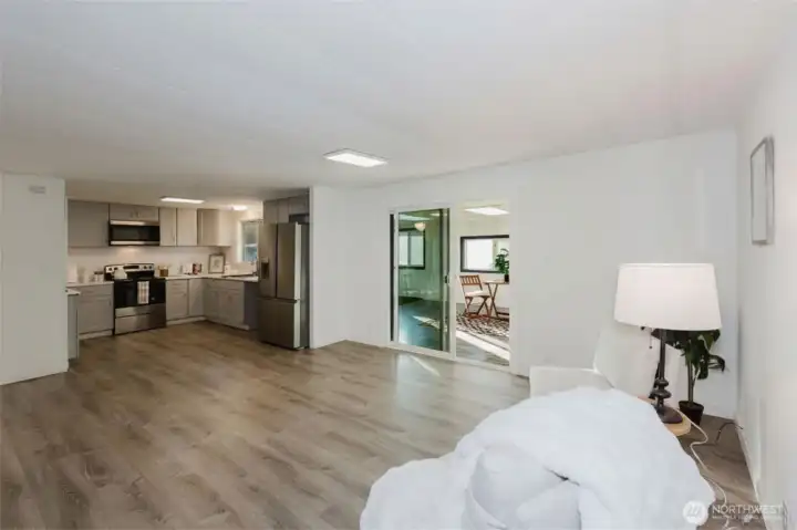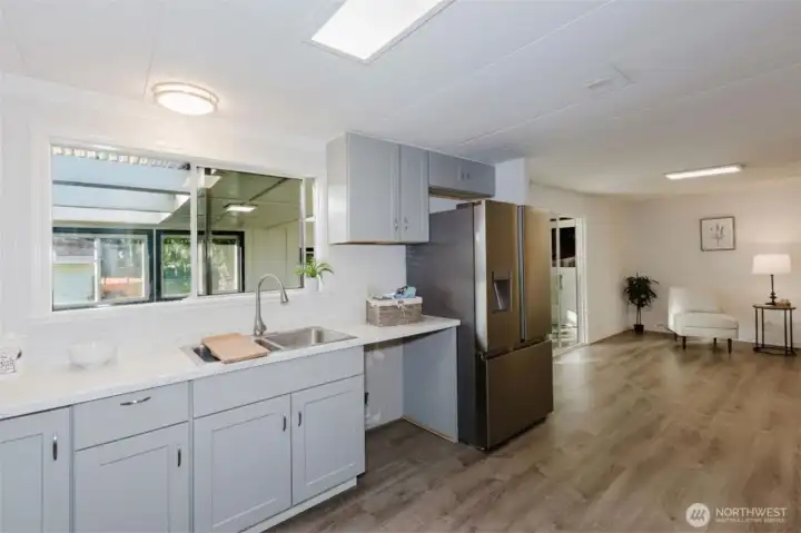 Spacious kitchen with ample counter space, storage, and natural light, opening into an additional living or flex area.