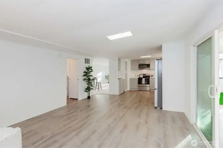 Expansive living area showcasing the flow between entry, living, and dining spaces, offering versatility for various furniture arrangements.