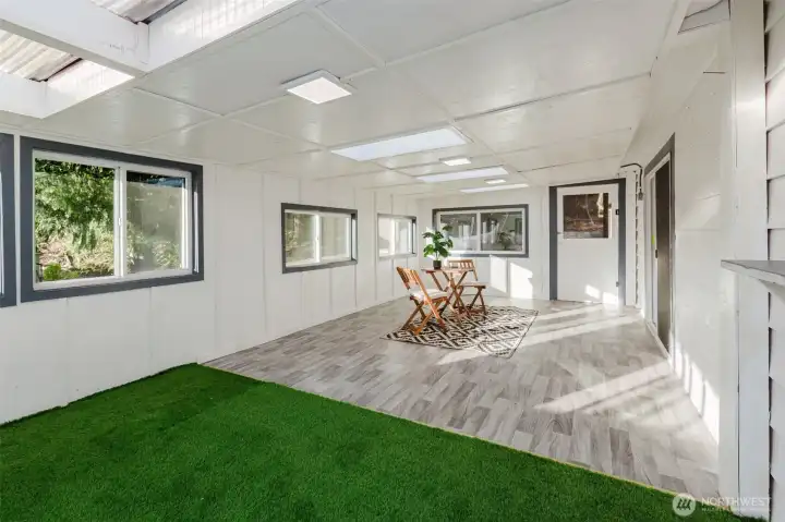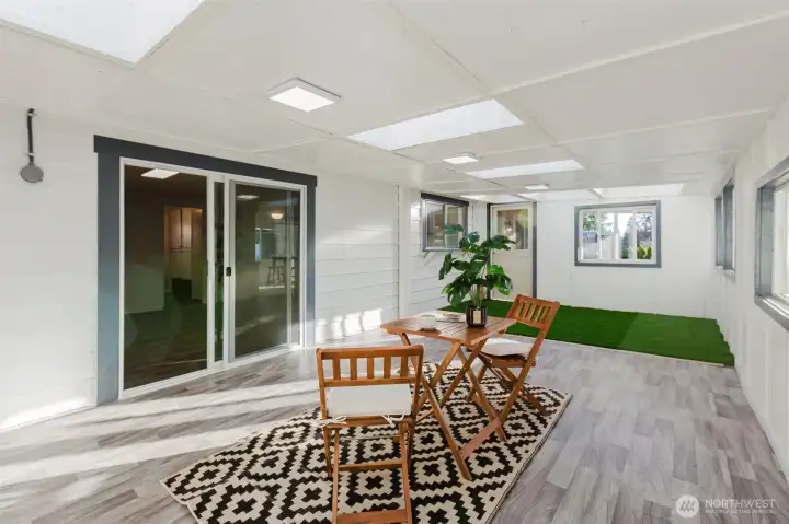 Light-filled enclosed sunroom with skylights, providing year-round usable space for relaxing or entertaining.