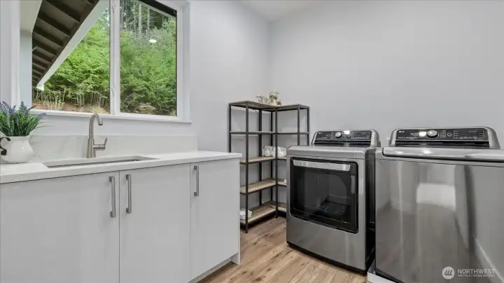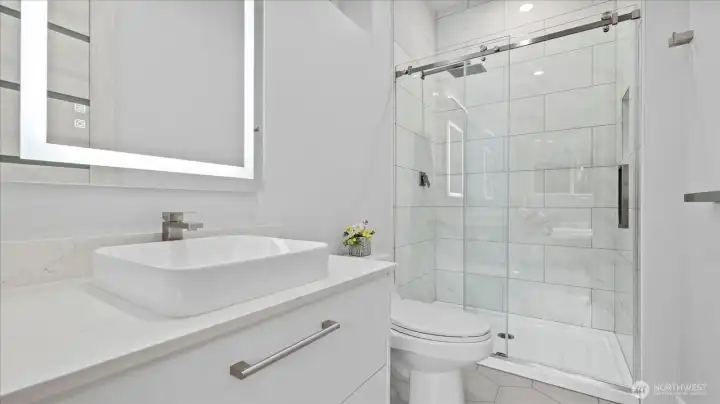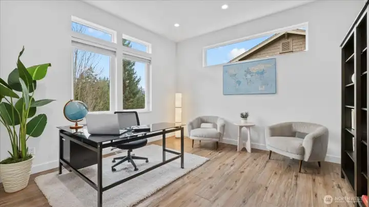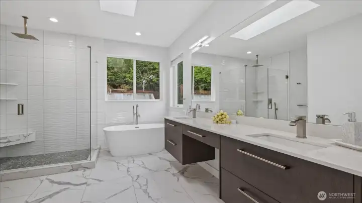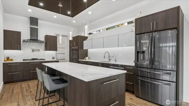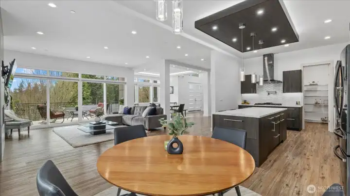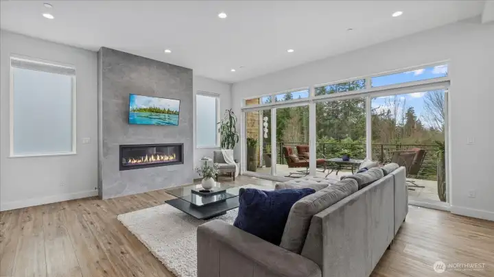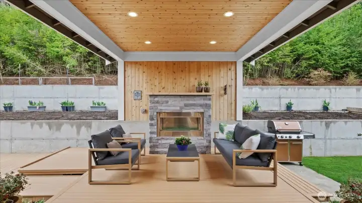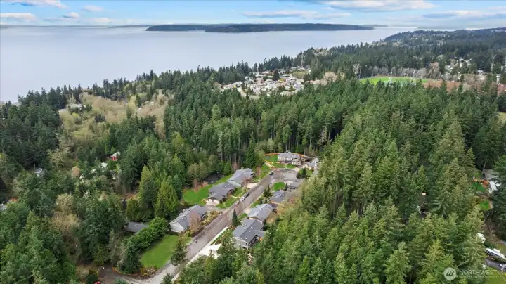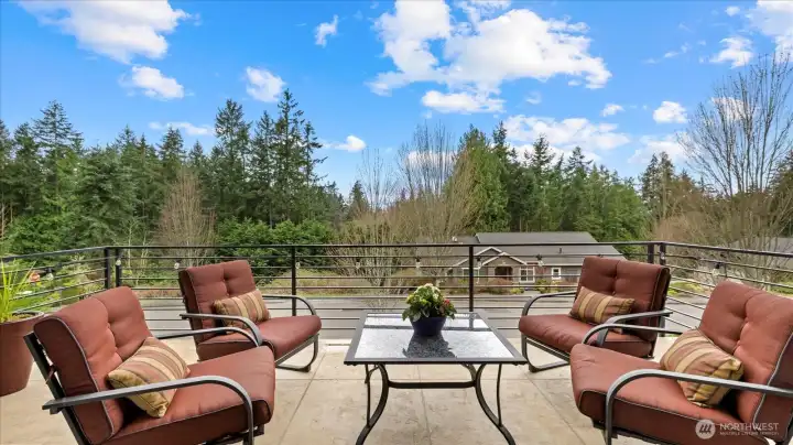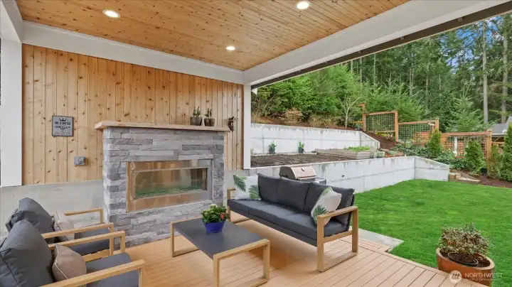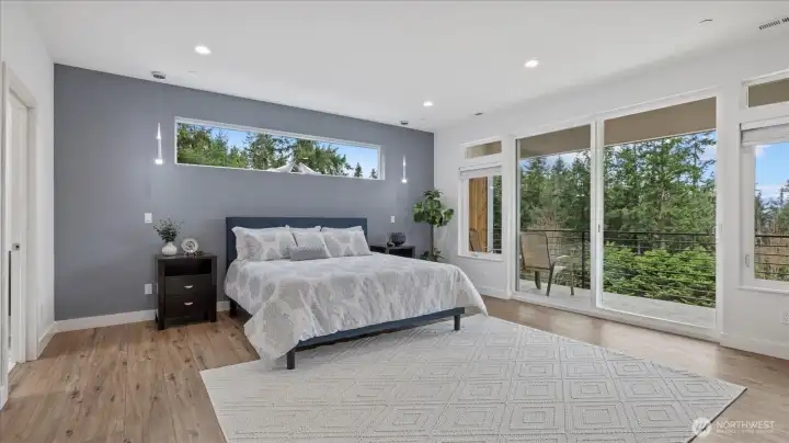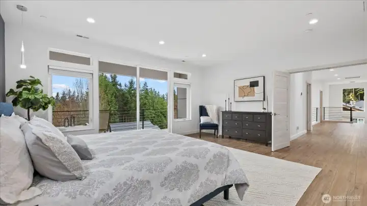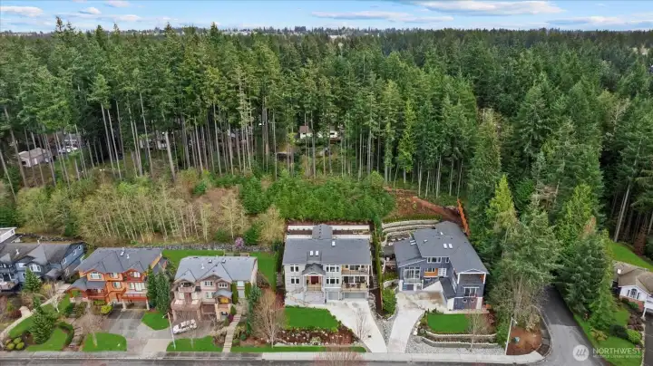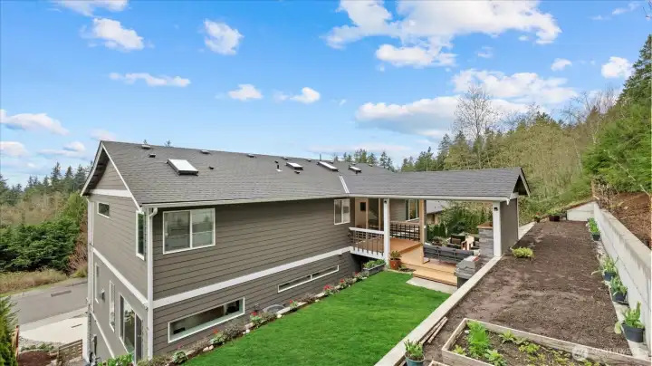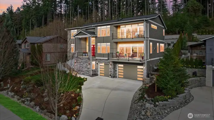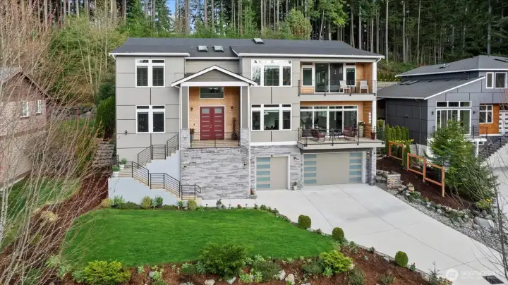 Welcome to this stunning, modern custom-built 5 bdr. home perfectly nestled on a quiet, private cul de sac. A massive open-concept living space invites you in with impeccable attention to detail and seamlessly flows into the gourmet kitchen. The main floor features a large guest suite & office space. Retreat upstairs to the huge primary suite boasting a luxurious 5-piece bathroom. Find an additional master bedroom suite plus 2 more oversized bedrooms upstairs. Massive & private covered patios & balconies throughout with in- & out-door gas fireplaces perfect for entertainment & relaxation. Enjoy beautiful territorial and mountain views of the Olympic mountains and private, sweeping greenery surrounding the home. Plentiful fruit trees & garden space in the backyard terraces. Heated floors in bathrooms throughout. Additional features include extra high ceilings, full sprinkler system, and A/C. Head downstairs to find a huge entertainment room, cedar-lined wine cellar, custom built wood sauna, and extra storage. This newly finished basement adds an extra 684 sqft to make this 4,639 sqft home. Very peaceful location and close to walking trails, parks, and nearby restaurants. Inspection report available upon request after showing.
