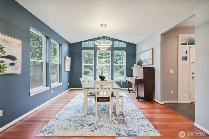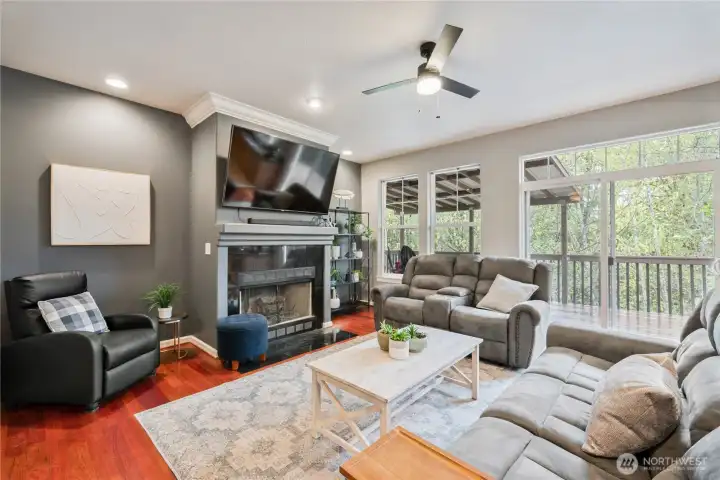 Beautiful, grand and spacious four-bedroom, 2.5-bath home featuring generous room sizes and expansive picture windows that fill the home with natural light. The main level offers 9-foot ceilings and an open-concept floor plan designed for comfortable living and entertaining. The living room showcases a cozy fireplace and direct access to a covered deck—perfect for year-round enjoyment. The large kitchen is well-appointed with stainless steel appliances, granite countertops and a central island ideal for gathering. The vaulted dining area is bright and inviting, enhanced by abundant windows. The primary suite is conveniently located on the main level and features two walk-in closets and a private en suite bath with double vanities, a soaking tub and serene views of the private, tree-lined backyard. The daylight basement boasts of tall ceilings, a spacious bonus room, three additional bedrooms and a full bath—offering excellent potential for multigenerational living or guest accommodations, along with ample storage. Outside, you’ll find a private backyard with mature trees, a charming chicken coop and two large covered decks that create an ideal setting for outdoor living and entertaining. Truly a beautiful home—schedule your private tour today!
