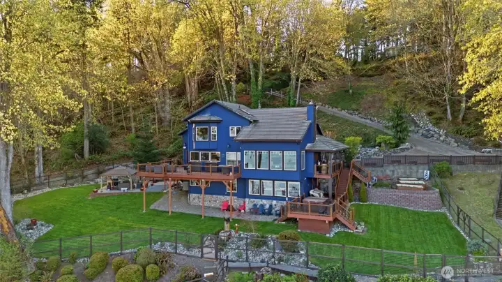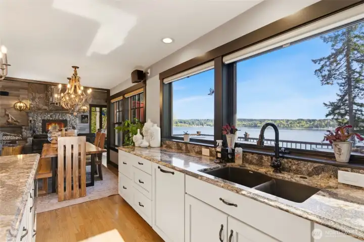 Perched on a rare stretch of pristine waterfront in Gig Harbor, this extraordinary remodeled estate offers refined Northwest design and resort-style living with 433 feet of private beach. A lighted pathway leads down to the quiet shoreline, complete with two mooring buoys and a newer boathouse. Inside, Northwest-chic design shines with custom décor, gorgeous hardwood floors, and a striking river rock fireplace. Expansive windows capture breathtaking views and open to a Trex deck with a hot tub and truly HUGE panoramic vistas. The massive chef’s kitchen features Viking appliances, custom cabinetry, and a charming bistro space. A dedicated office and custom lighting add both function and sophistication. The primary suite is a luxurious retreat with sweeping water views and a light and bright primary en suite. With an additional three rooms upstairs, there is room for everyone and lots of potential. The lower level offers a kitchenette for flexible living, a large recreational room, and another gorgeous bedroom. An income-generating DADU on the property provides added value and versatility or can be used to house guests for their very own private retreat. The property also features an oversized sports court and beautifully designed grounds. Recent upgrades include a new heat pump, new electrical and generator system, and a 50-year roof, offering modern comfort and long-term peace of mind. This property is a rare opportunity to own a private piece of Northwest paradise.