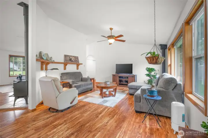 Cozy living room with wood stove—ideal for warm, inviting nights at home.