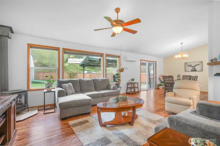 Comfort year-round with four heat sources including wood stove, gas stove, mini split A/C, and central heat.