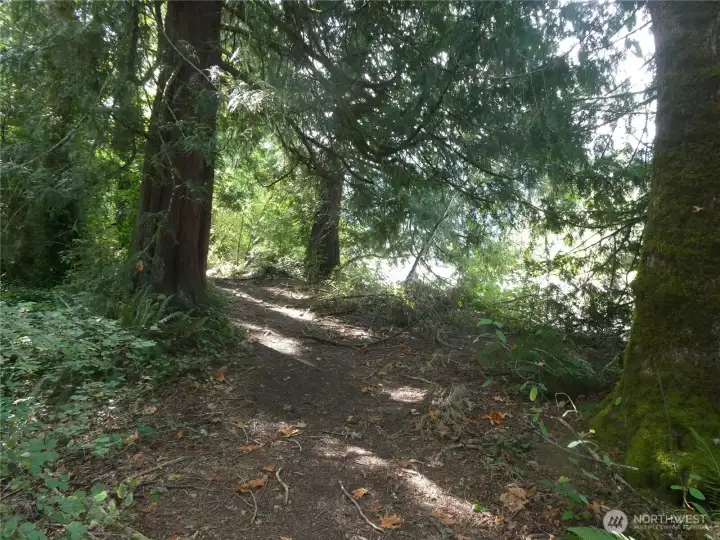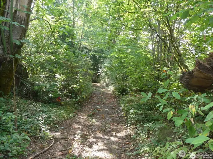 Wooded trail runs alongside the river's edge.