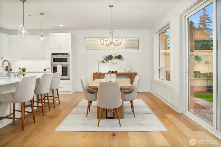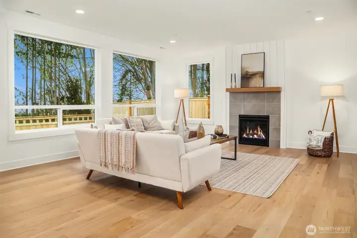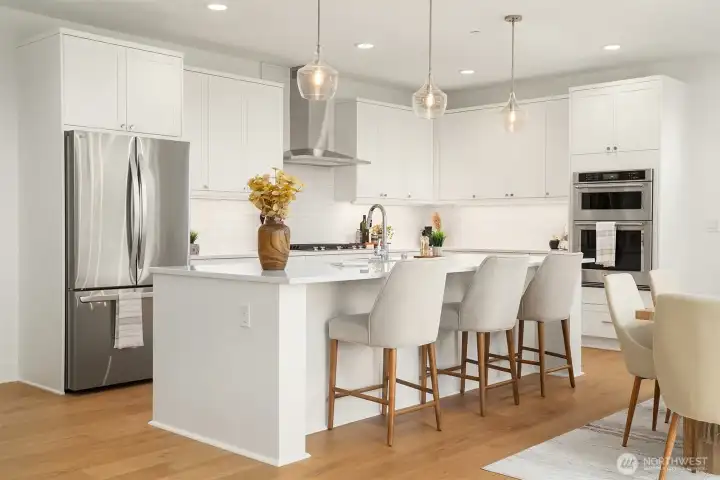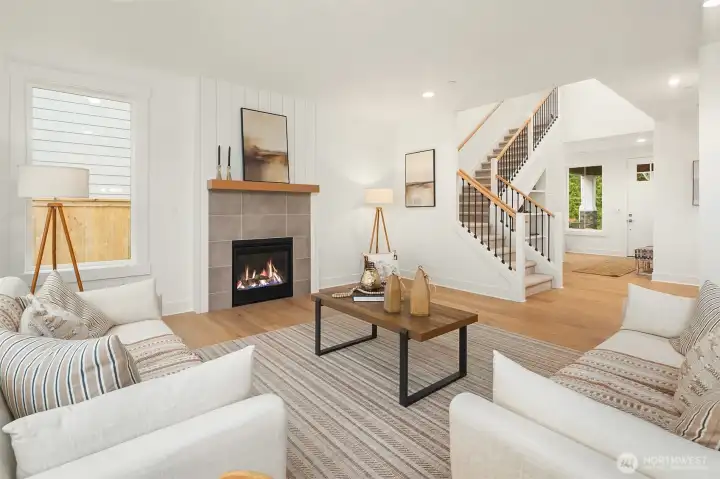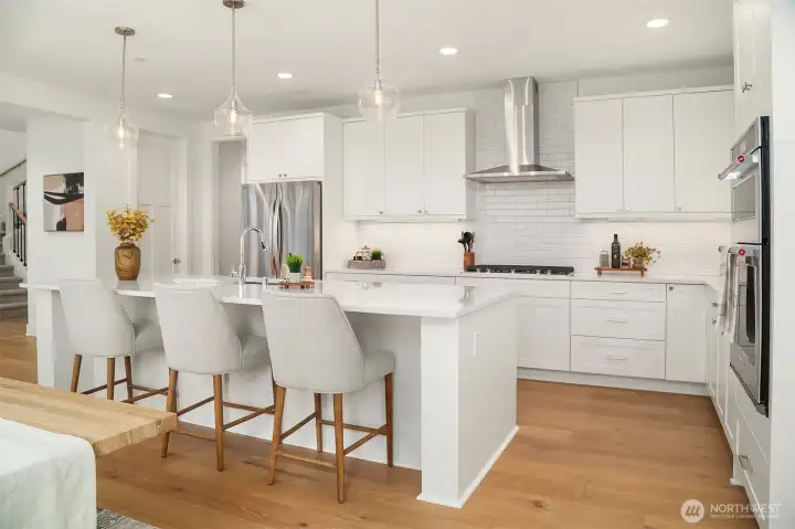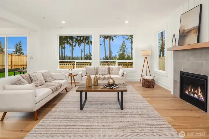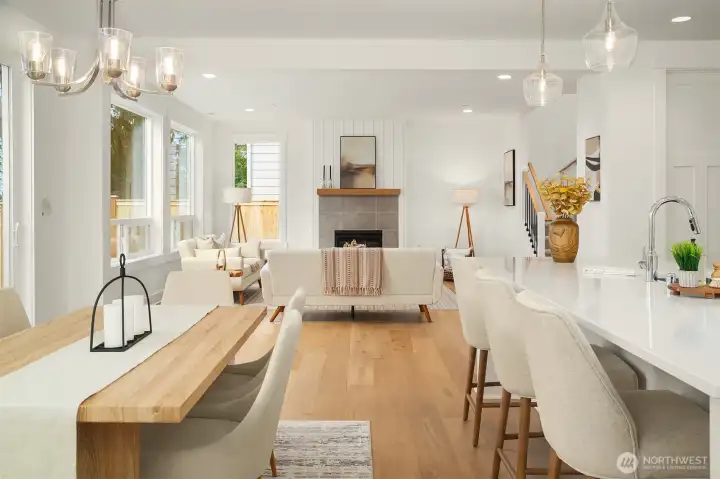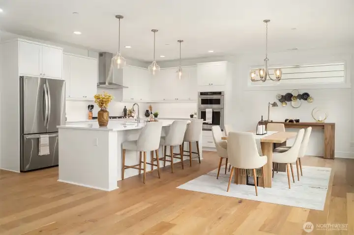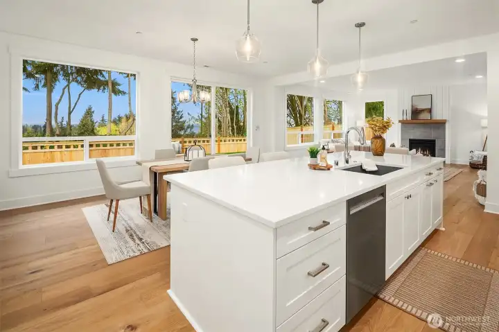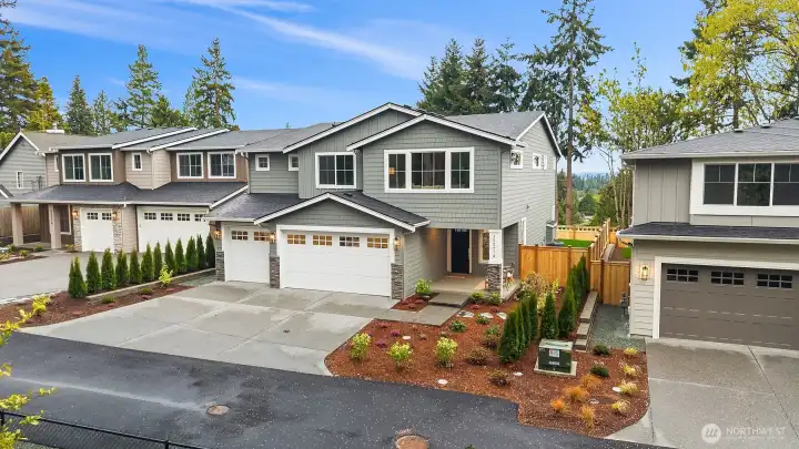 Select Homes’ new construction residence is nestled in Edmonds’ desirable Westgate neighborhood. This 5-bedroom, 3-bath home showcases elevated craftsmanship and a welcoming open-concept design throughout. Wide-plank oak hardwood floors span the main living areas, while the living room offers a cozy gas fireplace for year-round comfort. The staircase displays thoughtful detailing with a built-in bookcase and shiplap design. The entertainer’s kitchen is thoughtfully appointed with Mistério quartz countertops, a large island with seating, five-burner gas cooktop, and double oven perfect for both everyday living and hosting. A walk-in pantry provides ample storage. Just off the kitchen, the dining area is ideally situated for effortless gatherings. The first floor is complete with a main floor bedroom. Upstairs, the primary suite provides a spa-like retreat complete with a soaking tub and walk-in closet. Three additional spacious bedrooms, a full bathroom with a forest-green vanity, a roomy bonus room, and a laundry room complete the upper level. Also featured upstairs, a peekaboo view of the Olympics and Puget Sound. Step outside to a fully fenced, beautifully landscaped backyard with plenty of space for summer entertaining and play. A 3-car garage with EV charging readiness and a built-in mudroom right off the garage rounds out this exceptional home.
