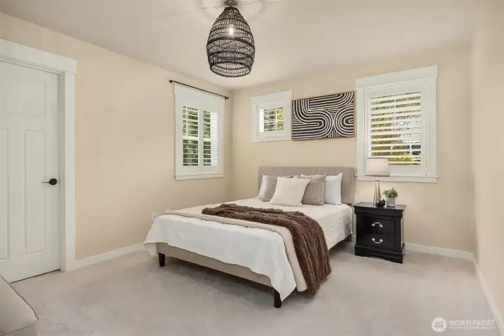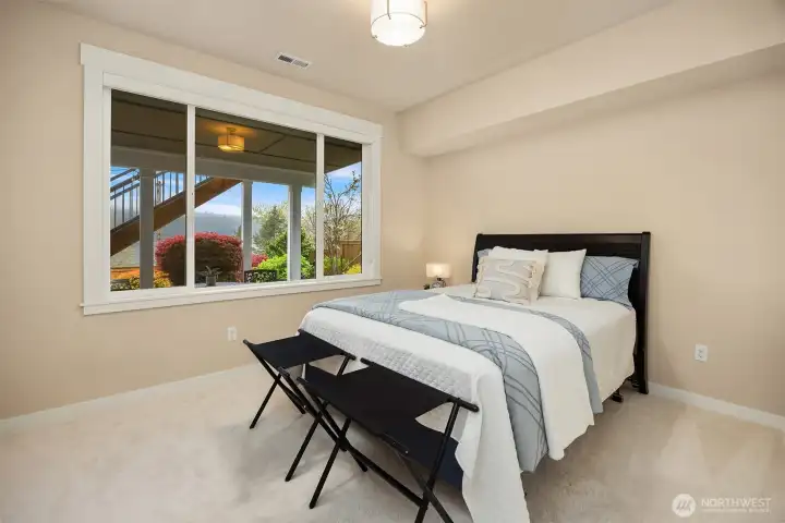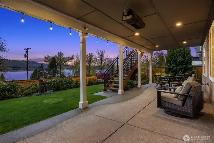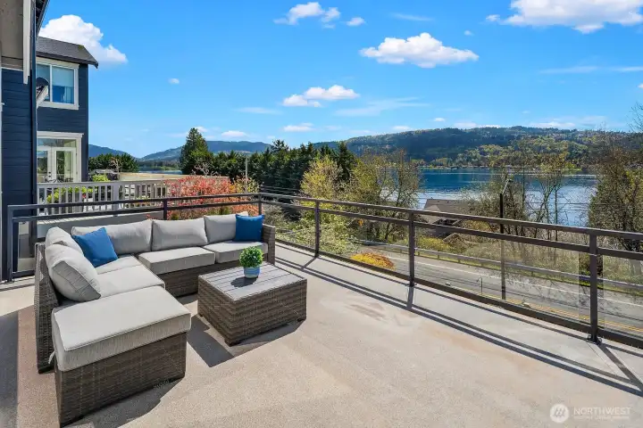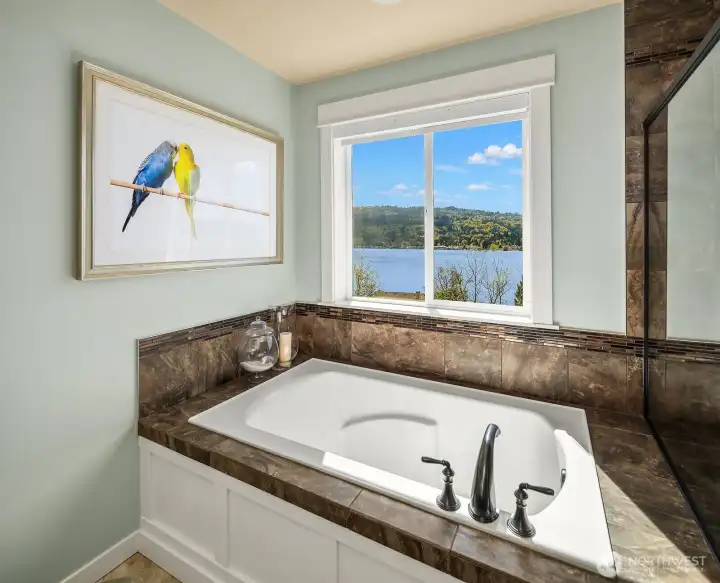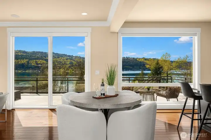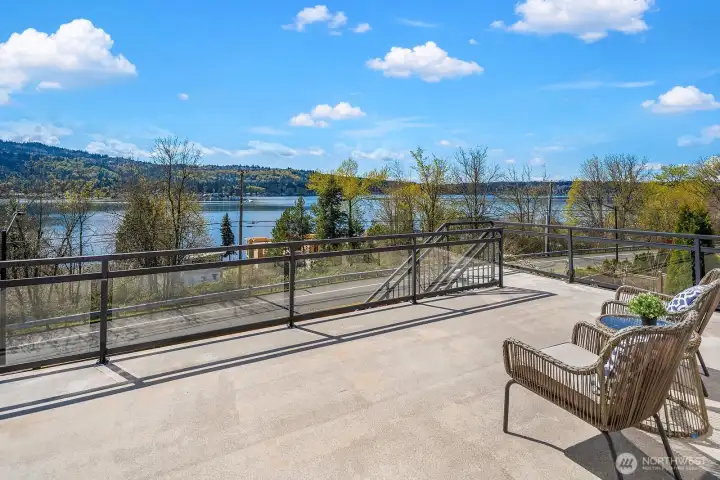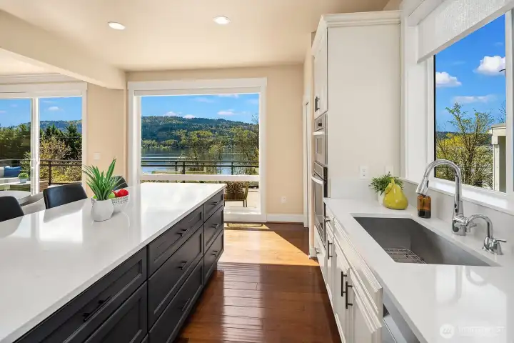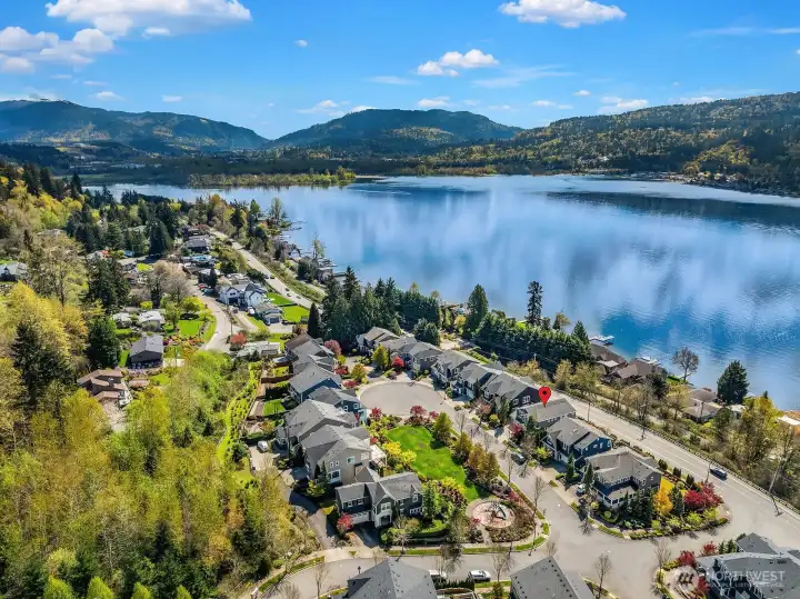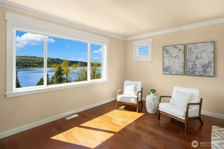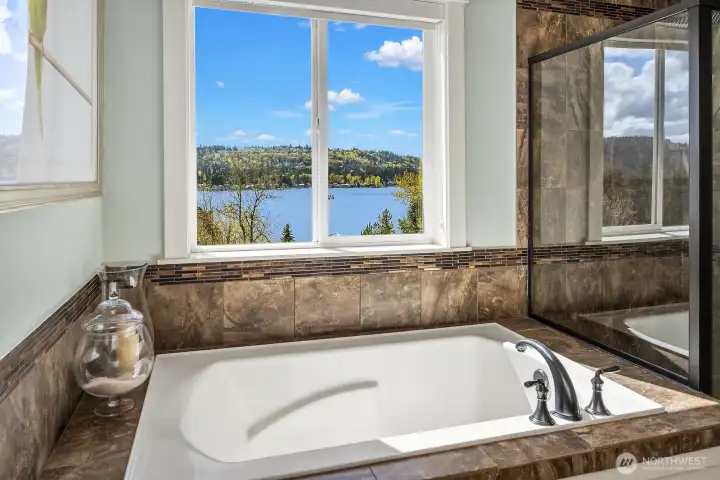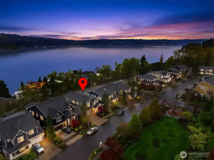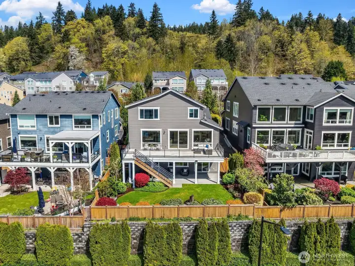 Located within prestigious Shorelane Vistas, this stunning 5 bedroom, 3.25 bath home captures panoramic Lake Sammamish views from all three levels and delivers a lifestyle of elegance, comfort, and natural beauty. Soaring ceilings and classic wainscoting set a tone of sophistication through the formal living and dining rooms, each curated with elevated finishes and designer touches. The chef worthy kitchen features an expansive granite island with generous storage flowing into a warm sunlit family room with gleaming hardwood floors. Retreat to the luxurious primary suite with spa inspired appointments, a lavish 5-piece bath, sweeping water views, and custom California Closets built ins. Secondary bedrooms also feature California Closets and appointed bathrooms. The lower-level bonus room with private guest suite and patio access is ideal for guests or extended stays. The heated lower patio and upper deck with stairs to the yard make outdoor entertaining effortless. The fenced backyard features professionally installed irrigation, landscape lighting, and a direct plumbed fountain for a low maintenance retreat. The dream garage is fully finished with custom shelving and upgraded flooring. Premium upgrades include a whole-home generator, central air conditioning, an EV charger, and new carpet. Served by the top-rated Issaquah School District with easy access to amenities, dining, and commuter routes, this exceptional home is as convenient as it is spectacular.