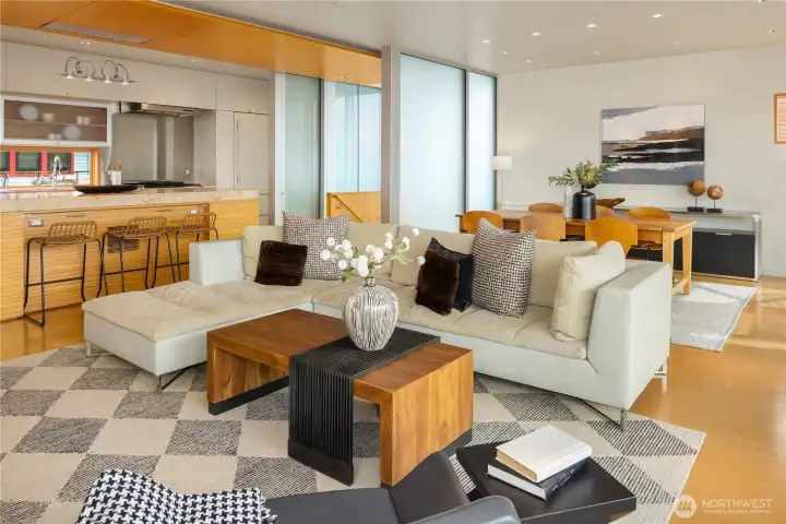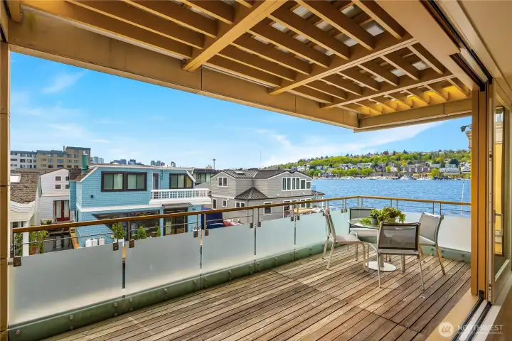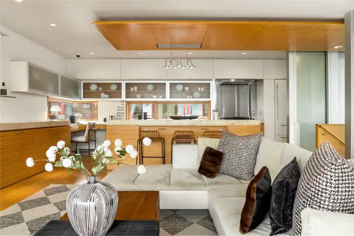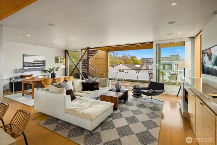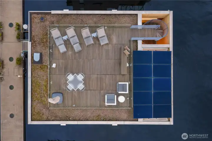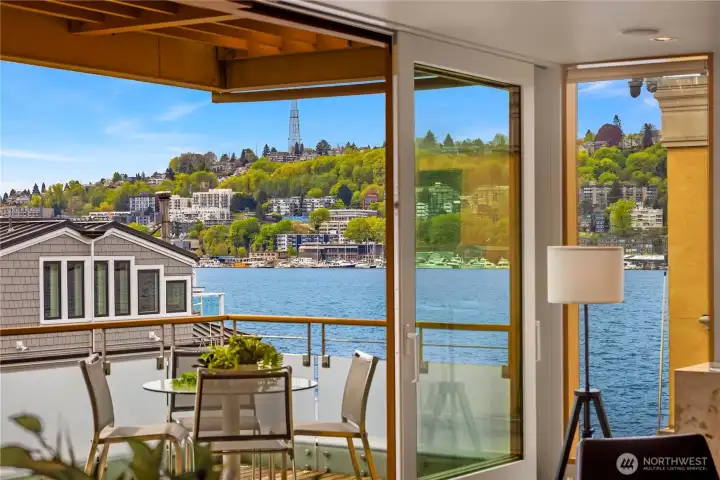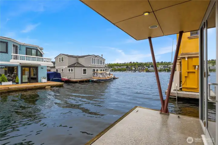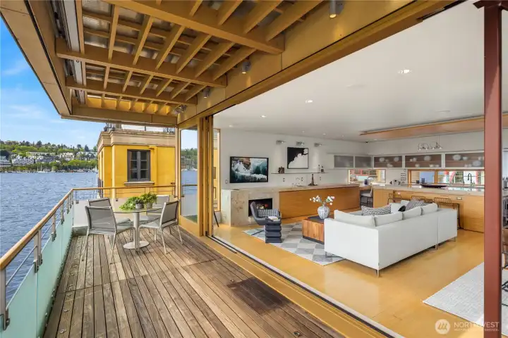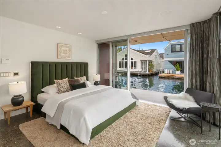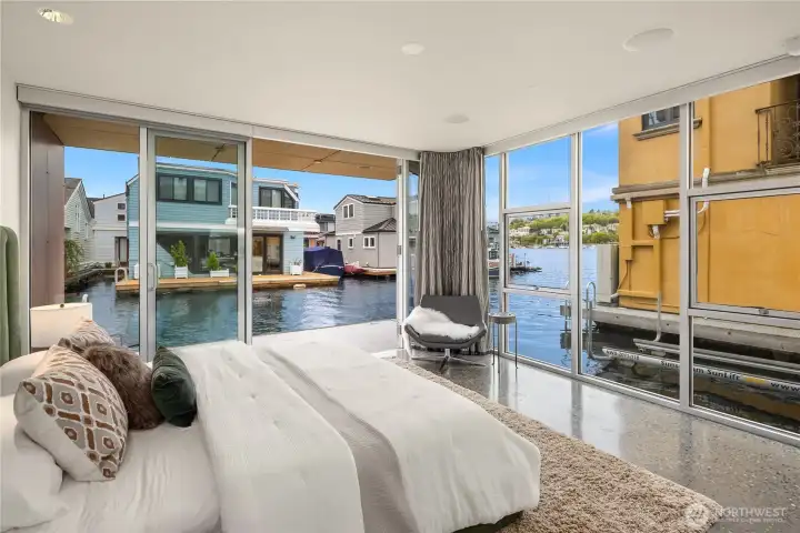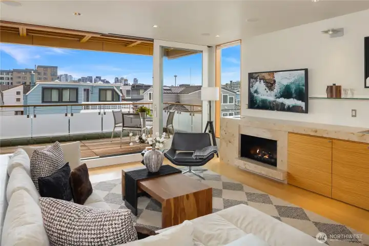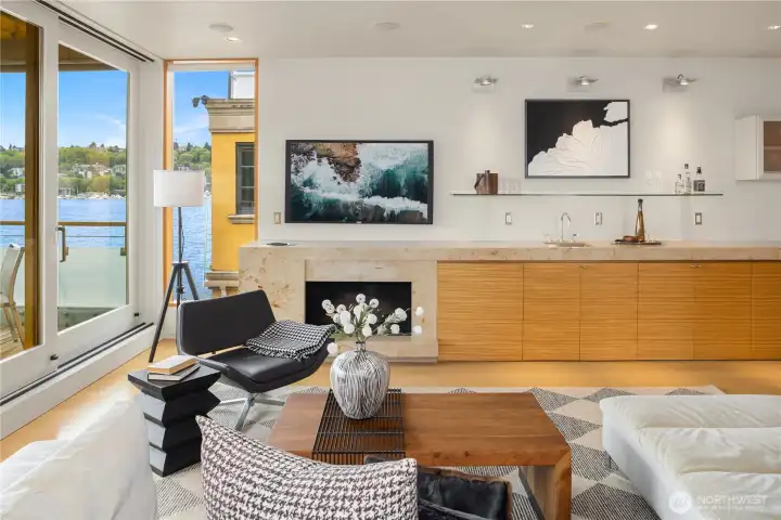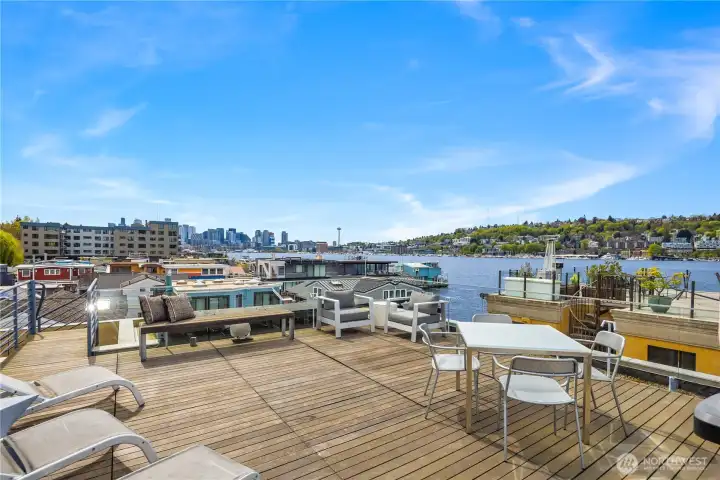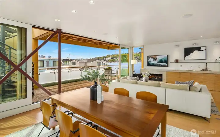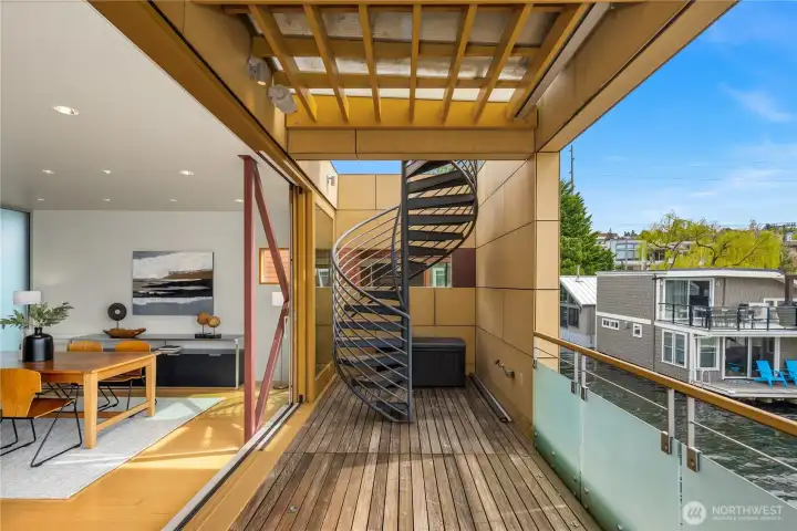 Fairview Landing #6 // Designed by Vandeventer + Carlander Architects, this modern floating home continues Seattle’s rich tradition of life on Lake Union, offering coveted southern exposure and sweeping views of Downtown, Queen Anne Hill, Gas Works Park, the Olympics and Space Needle. Thoughtfully designed, the floorplan inverts a traditional layout by placing public living spaces on the upper level to maximize light, views, and entertaining. Expansive glazing and large sliding doors open to multiple decks, including a rooftop terrace accessed by a sculptural circular stair, creating seamless indoor-outdoor flow. Private spaces are located on the entry level, while a rare underwater lower level with true porthole windows offers an immersive connection to the lake. The home’s carved massing, recessed decks, and material shifts create architectural depth and integrity. Sustainable features include hydronic in-floor heating via energy-efficient heat pump, heat-exchange ventilation, solar power, and strategically placed glazing for passive performance. Exterior fiber cement rainscreen panels and aluminum cladding pair with Alaskan yellow cedar-framed windows, while interiors feature mahogany, zebrawood, bamboo flooring, and warm wood accents, all balancing modern design with livability. Located within the sough after Fairview Landing community with dedicated parking and moorage with remote boat lift, this is refined waterfront living in the heart of the city.