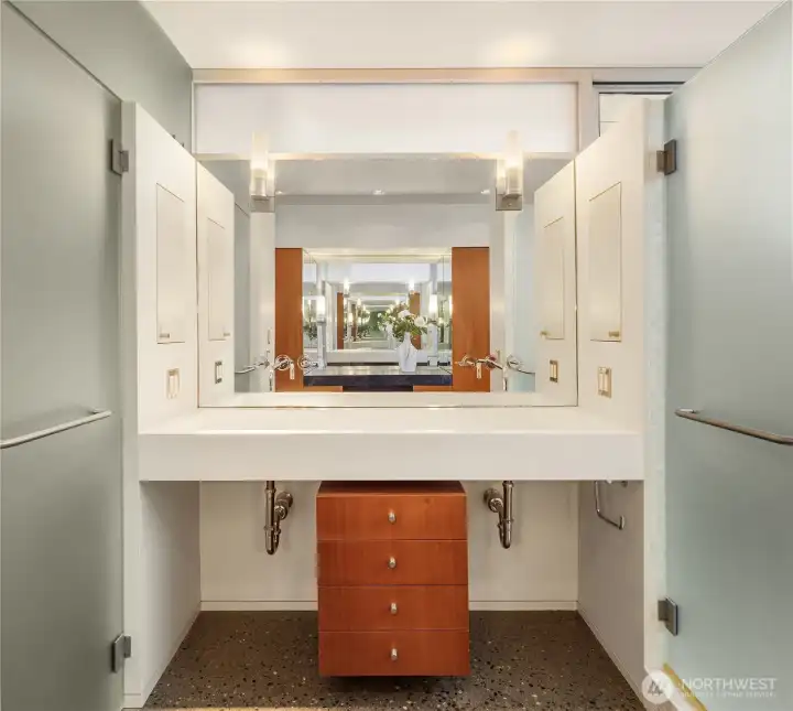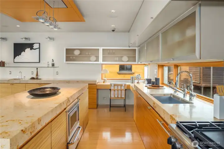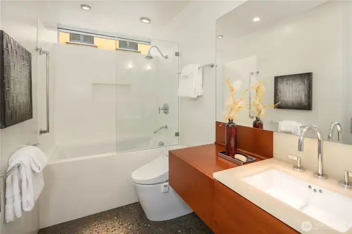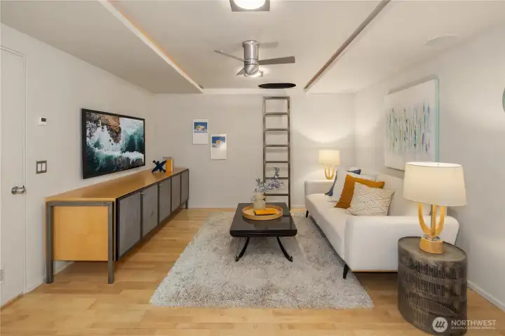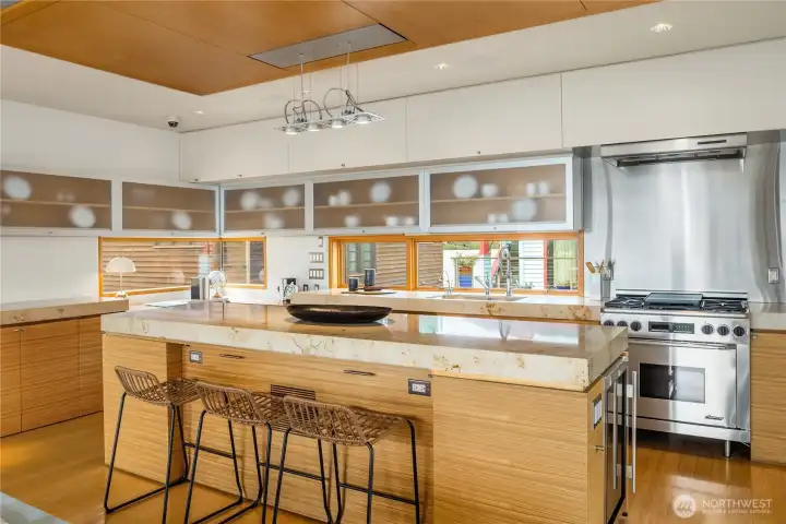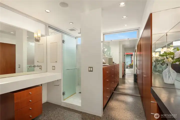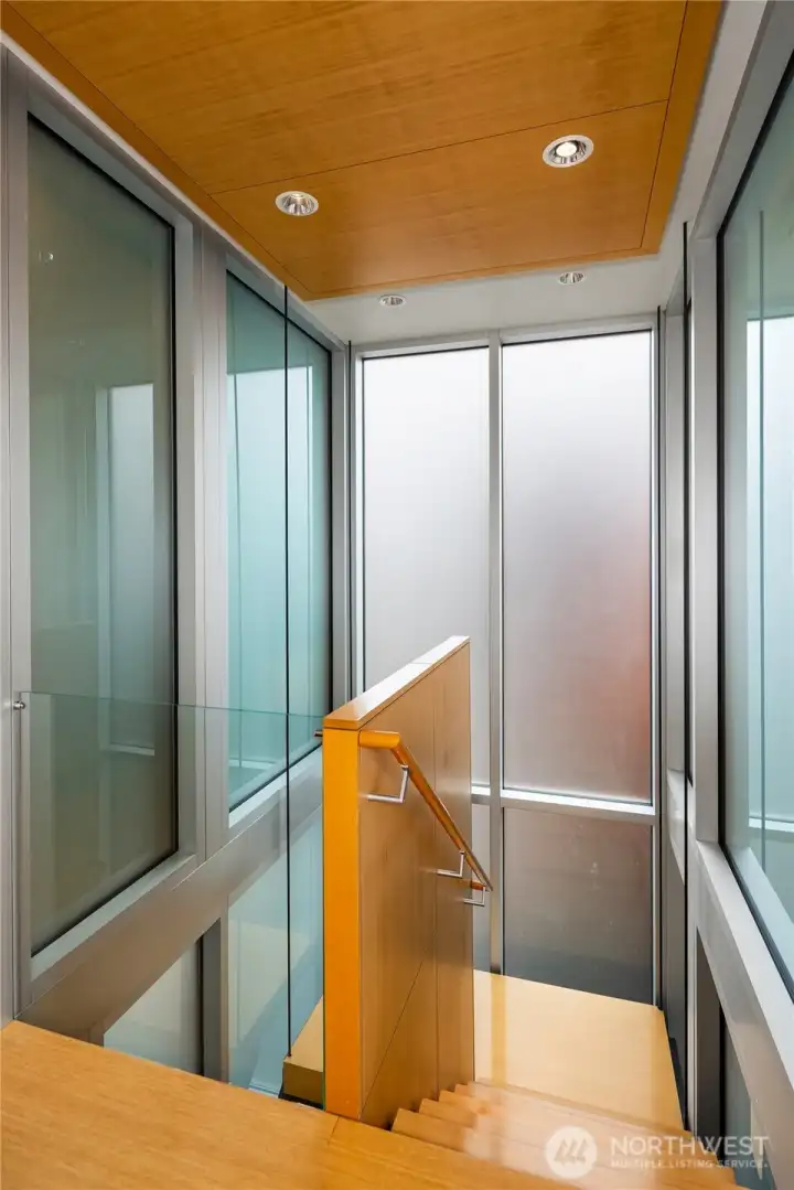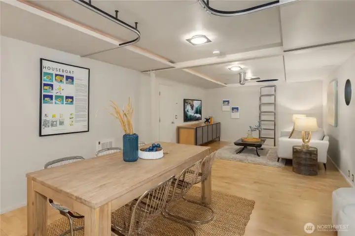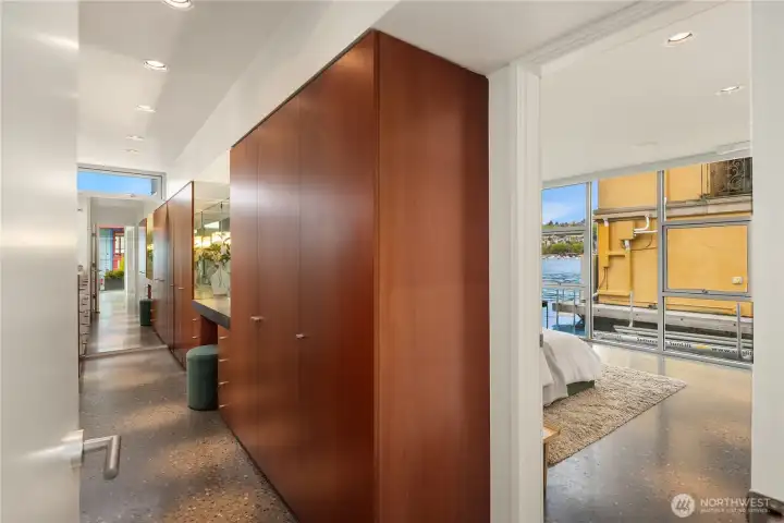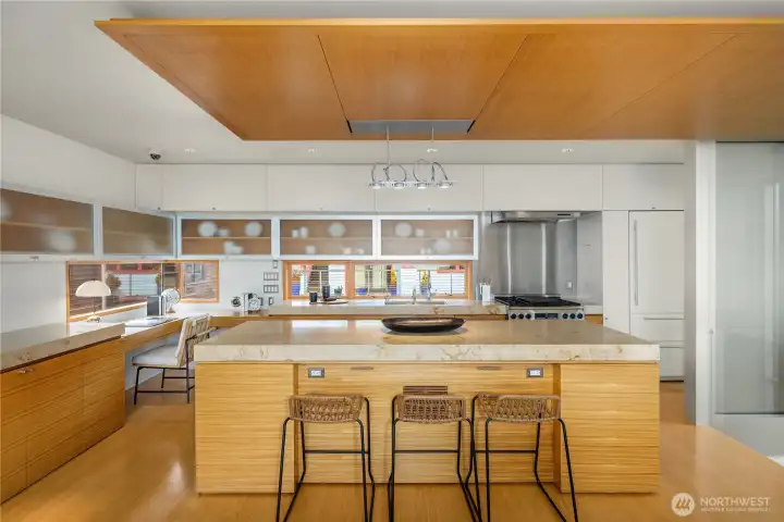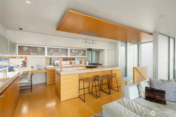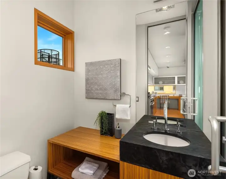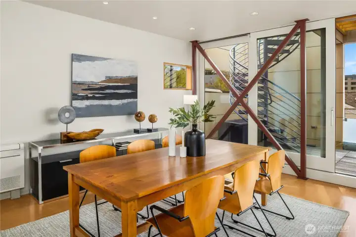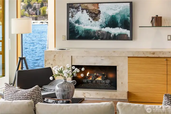 Fairview Landing #6 // Designed by Vandeventer + Carlander Architects, this modern floating home continues Seattle’s rich tradition of life on Lake Union, offering coveted southern exposure and sweeping views of Downtown, Queen Anne Hill, Gas Works Park, the Olympics and Space Needle. Thoughtfully designed, the floorplan inverts a traditional layout by placing public living spaces on the upper level to maximize light, views, and entertaining. Expansive glazing and large sliding doors open to multiple decks, including a rooftop terrace accessed by a sculptural circular stair, creating seamless indoor-outdoor flow. Private spaces are located on the entry level, while a rare underwater lower level with true porthole windows offers an immersive connection to the lake. The home’s carved massing, recessed decks, and material shifts create architectural depth and integrity. Sustainable features include hydronic in-floor heating via energy-efficient heat pump, heat-exchange ventilation, solar power, and strategically placed glazing for passive performance. Exterior fiber cement rainscreen panels and aluminum cladding pair with Alaskan yellow cedar-framed windows, while interiors feature mahogany, zebrawood, bamboo flooring, and warm wood accents, all balancing modern design with livability. Located within the sough after Fairview Landing community with dedicated parking and moorage with remote boat lift, this is refined waterfront living in the heart of the city.
