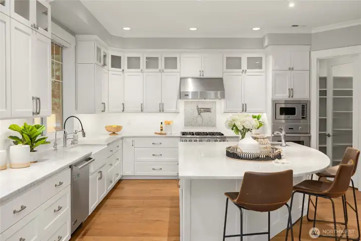 Chef's kitchen with a large island, marble countertops, Viking appliances, wet-bar and walk-in pantry.