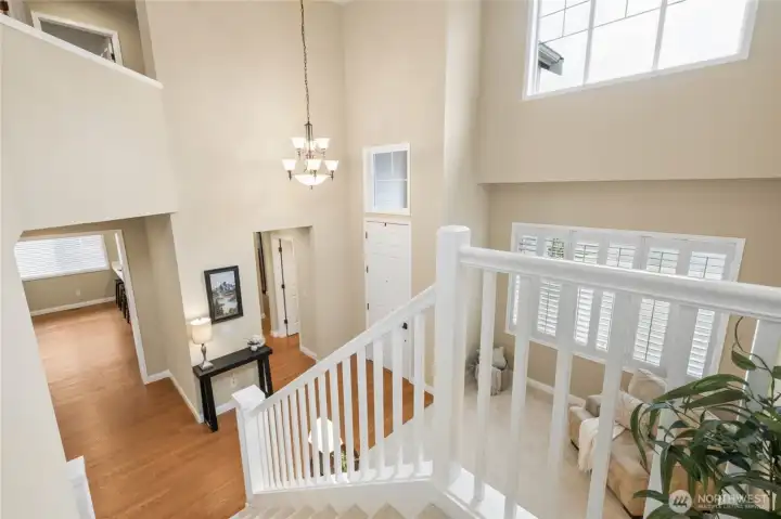 Entry with soaring ceiling welcomes you to the elegant living room.