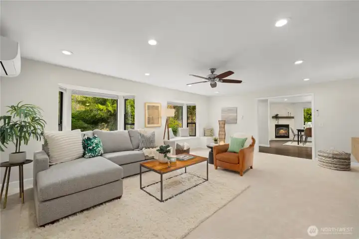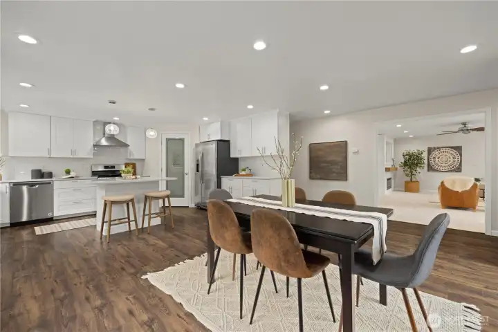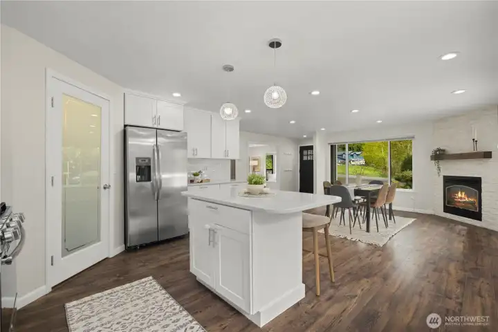 lovely modern kitchen and dining room with fireplace. Tons of natural light and direct access to the deck.
