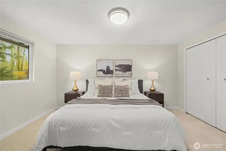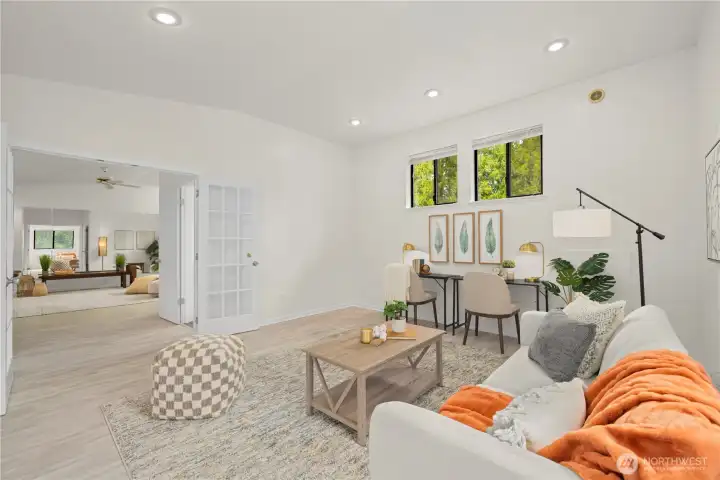 Upstairs bonus room with french doors. Could easily be used as a guest bedroom with full closet and attached bathroom.