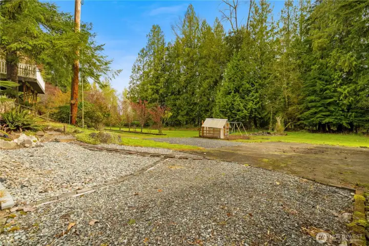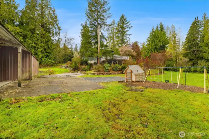 Large shop with additional carports, previously used as home gym-- possibliities are endless. Swing set/play area, firepit.