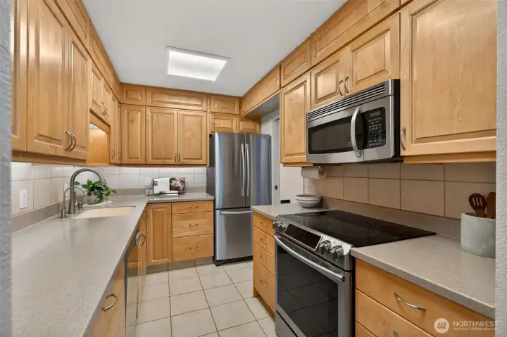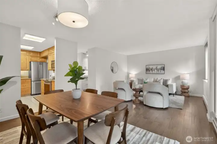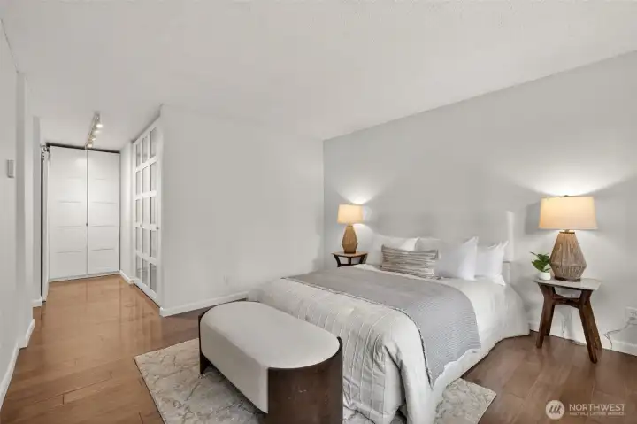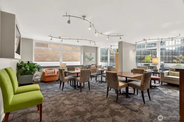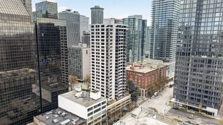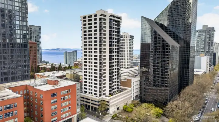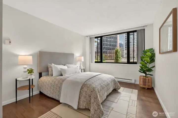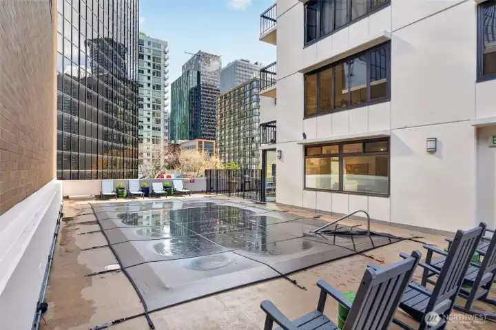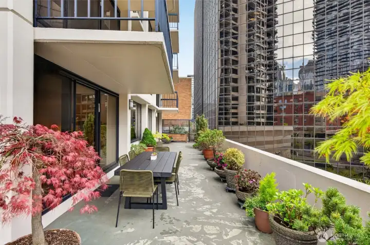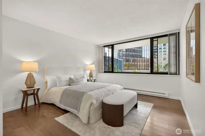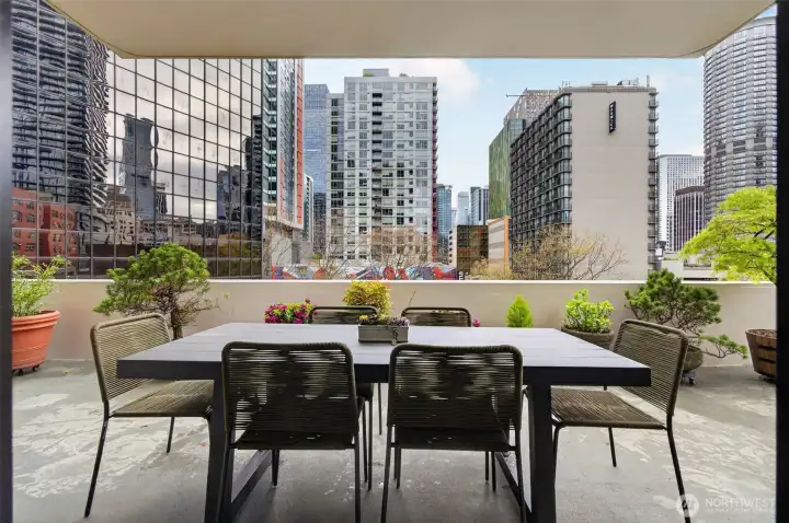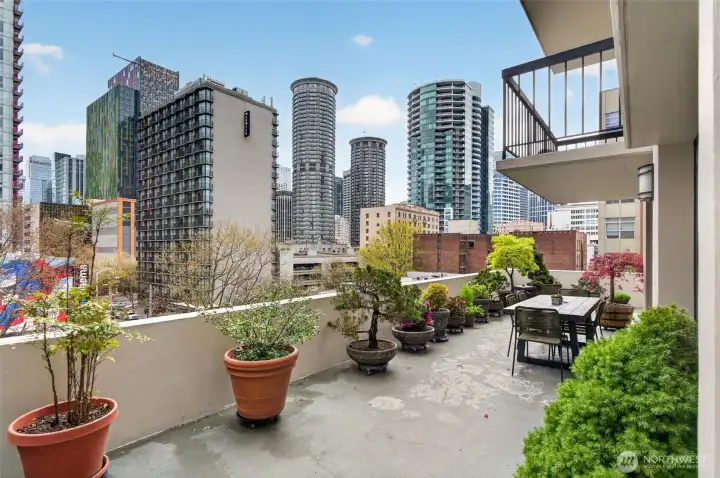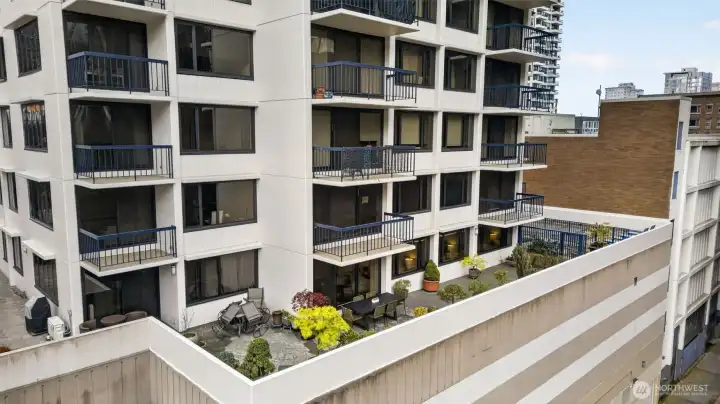 Welcome home to a rare retreat in the heart of Belltown! This thoughtfully updated 2 bed, 2 bath, 1300 sq ft condo at the Royal Crest lives unlike anything else in the building, anchored by a private 20ft x 80 ft patio that opens to a quiet, protected courtyard, a layout that is perfect for summer entertaining. Inside you'll find fresh flooring, updated bathrooms, refreshed appliances, and generous storage with built-in organization systems throughout. In-unit washer and dryer, plus a dedicated 6'x6'x8' assigned storage unit for everything else. Ownership at Royal Crest is genuinely turnkey. HOA dues cover all utilities (electricity, heat, water, sewage, garbage), and the building boast healthy reserves and no pending special assessments. Building amenities include an outdoor pool, sauna, fitness center, community room, BBQ area, and on-site manager. Park with confidence in your deeded garage stall, complete with a free, unmetered 20 amp EV charging outlet. With a walk score of 99, a transit score of 100, you're in the middle of everything: a 5 min walk to the lightrail, bus lines at the corner, and Pike Place Market, the renovated waterfront, Climate Pledge Arena, Amazon HQ, and more, all within easy reach. Quiet courtyard living with downtown at your doorstep. A rare combination in Belltown.