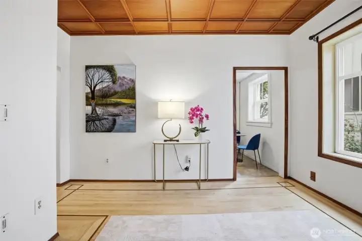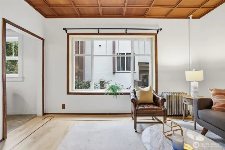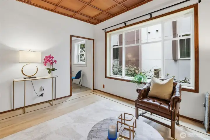 South facing windows with coffered ceilings keeping with the historical charm of this 1910 building.