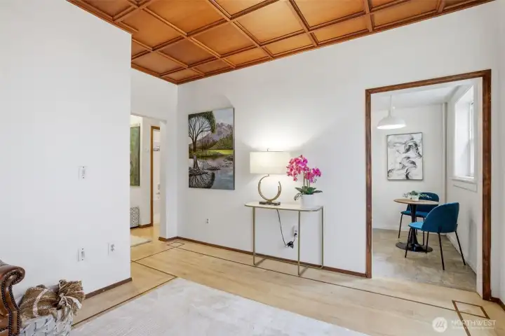 Inviting living space that captures the character of this turn-of-the-century co-op. The coffered wood ceiling adds warmth and architectural detail, while clean walls and updated finishes keep the room feeling fresh and livable. Generous proportions allow for multiple seating areas, creating a comfortable setting for both everyday living and hosting. A timeless blend of historic charm and modern simplicity in the heart of Capitol Hill.