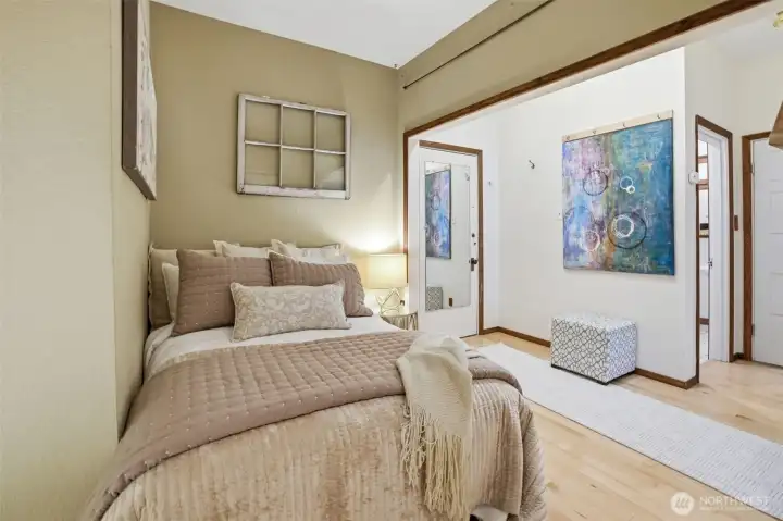 Spacious bedroom designed for rest and privacy. With no exterior windows, the space offers complete light control, creating a naturally dark environment that supports deeper sleep and a calm, relaxed feel.