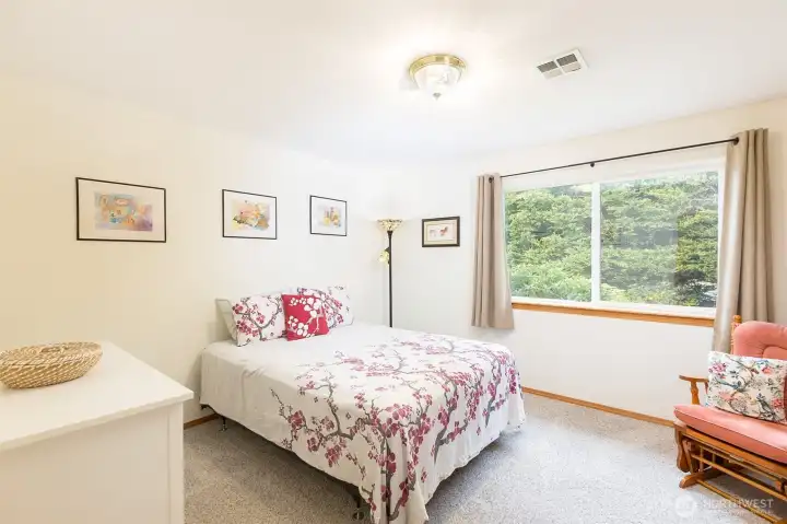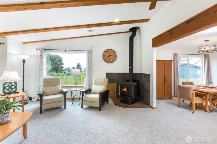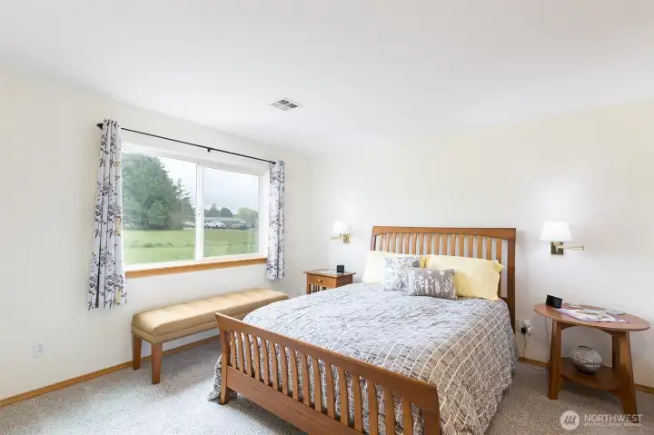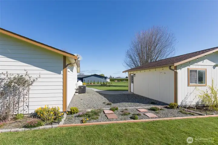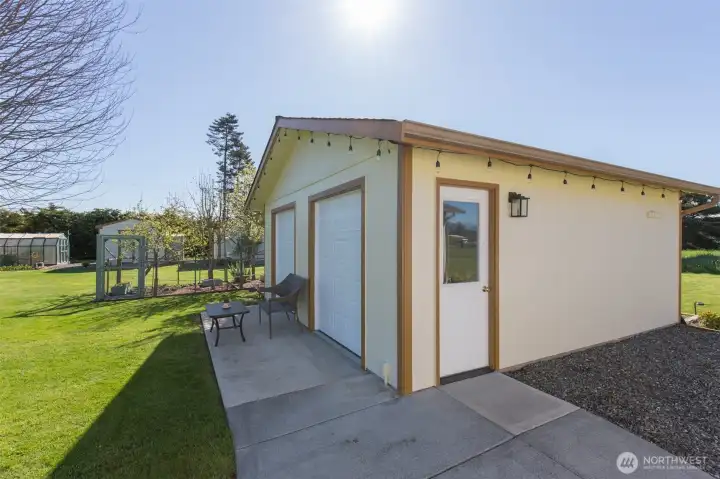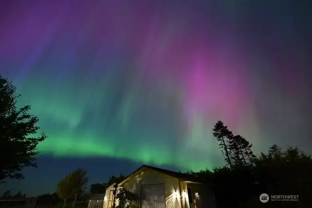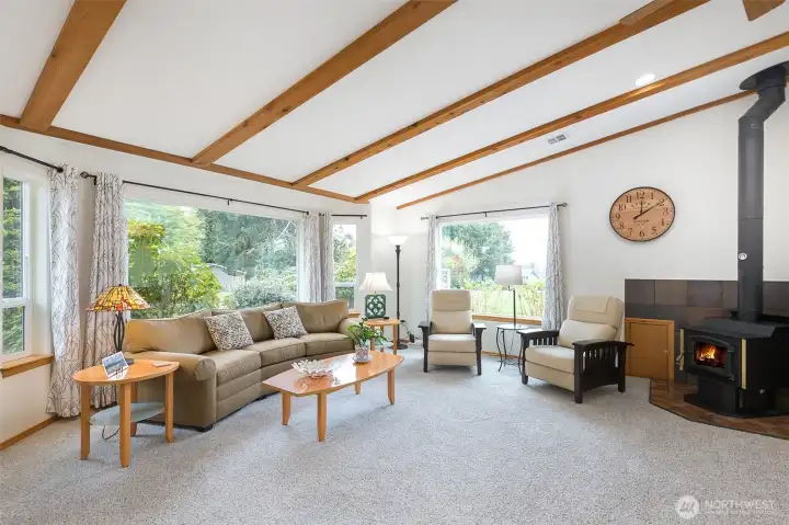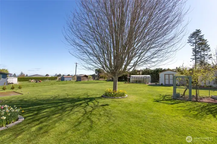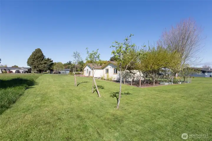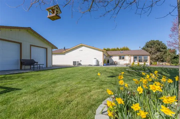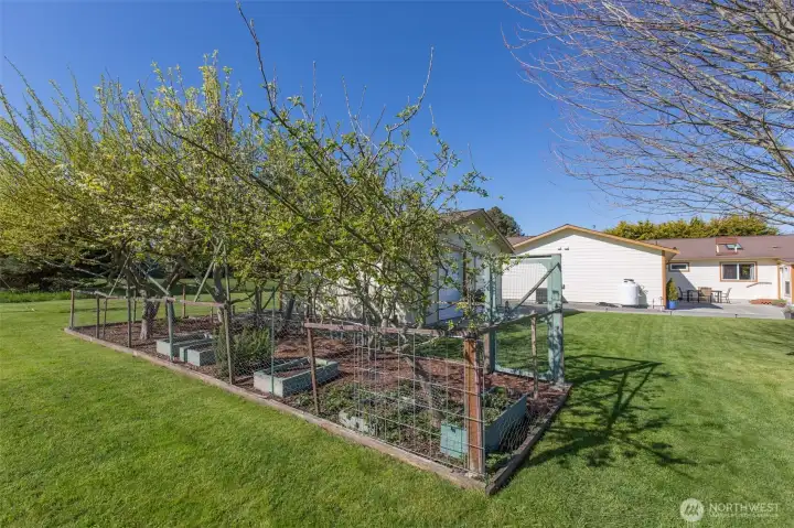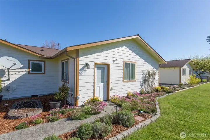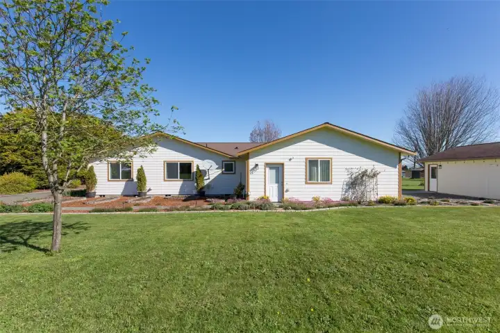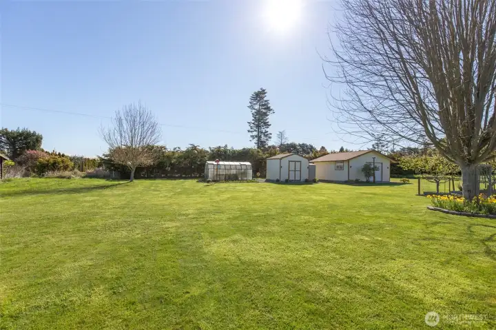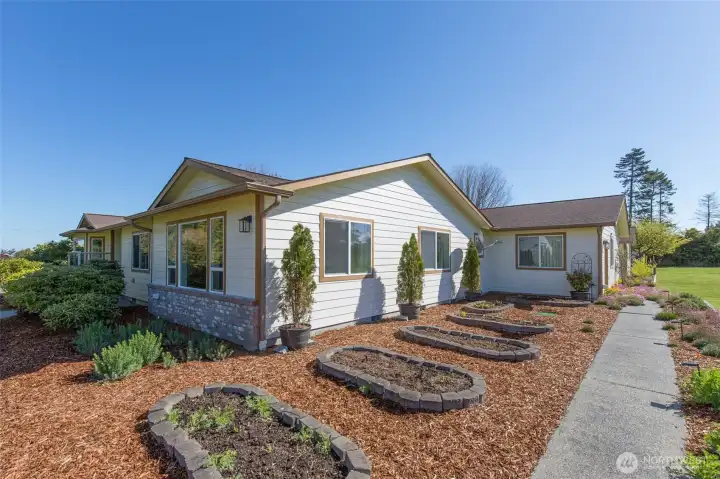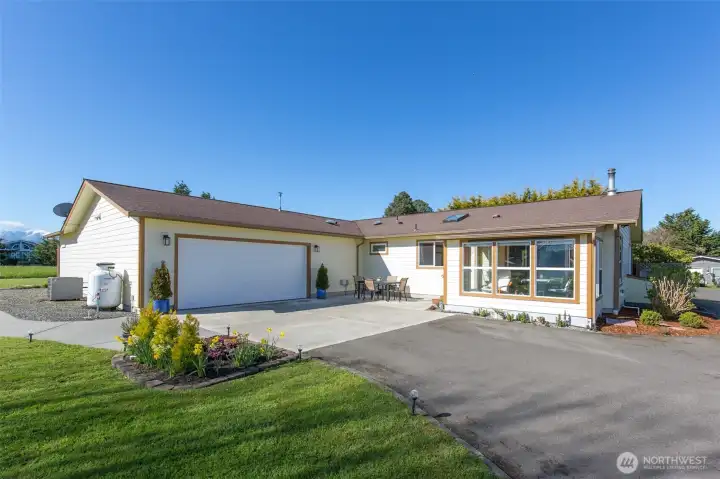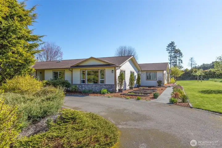 Mountain View retreat on .67 acres of beautifully manicured grounds, gardens, and orchard! This spacious 2,175 sq ft home offers 3 bedrooms and 2.5 baths with vaulted ceilings and striking cedar beams, creating a warm yet open feel. Enjoy year-round natural light in the attached sunroom just off the dining area. The kitchen features granite countertops, propane cooktop, double ovens, stainless steel appliances, and updated lighting—ideal for both everyday living and entertaining. Additional highlights include a woodstove, heat pump, central vacuum, wide hallways, and three solar tubes. Over 250 outlets and upgraded LED lighting add convenience and functionality. A standout feature is the extensive shop and garage space totaling 1,788 sq ft—including an attached oversized 2-car garage with office/studio, a second garage with its own electrical panel, a third outbuilding perfect for hobbies, plus an additional equipment shed and greenhouse. The property is supported by Cline Irrigation and includes fruit trees, berries, a variety of flowers, shrubs, and outdoor lighting throughout. Community beach access. A rare combination of space, utility, and scenic beauty—perfect for hobbyists, gardeners, or those seeking a peaceful lifestyle with room to grow.