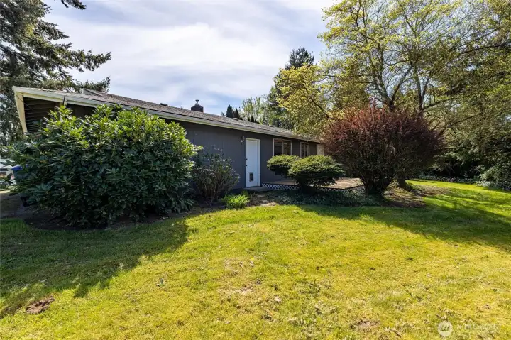 Large back yard with deck off kitchen/laundry area.