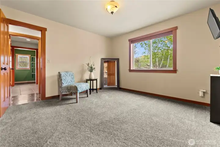 Anteroom to primary bedroom can serve as a work out space, office, reading room, nursery, or craft room.