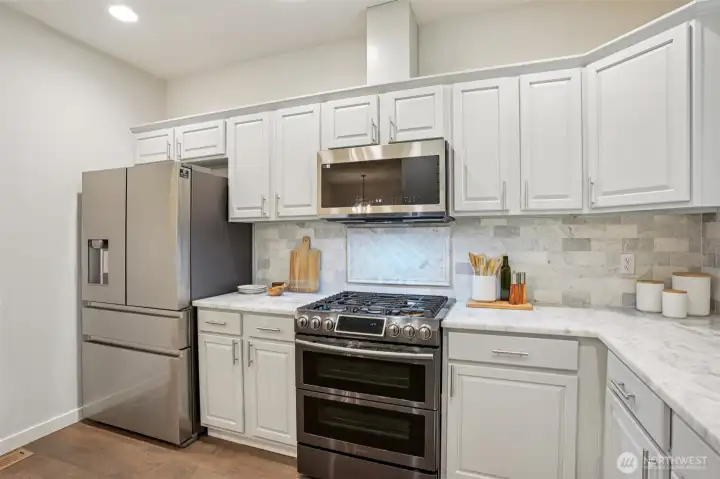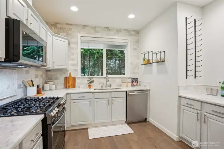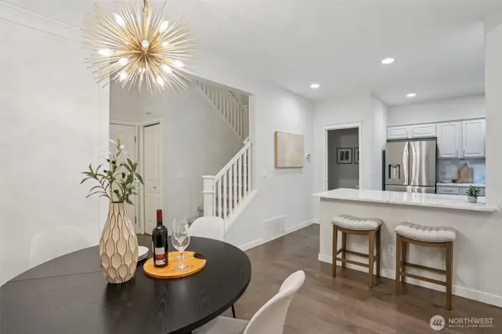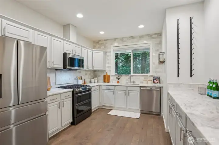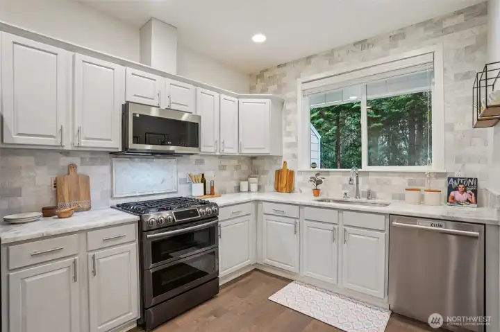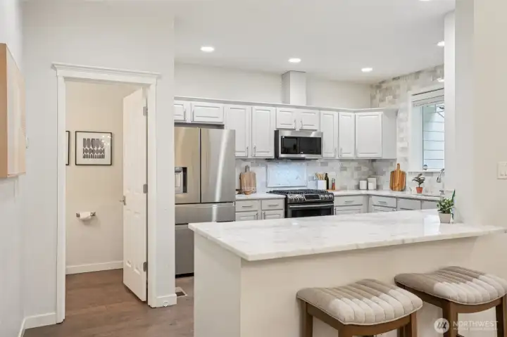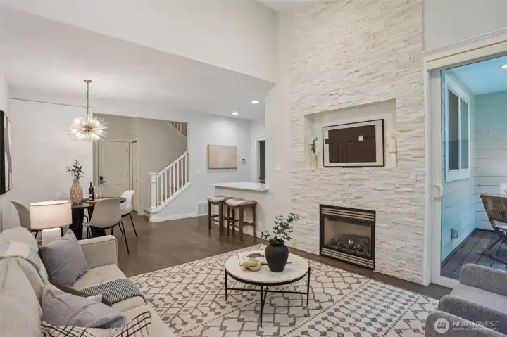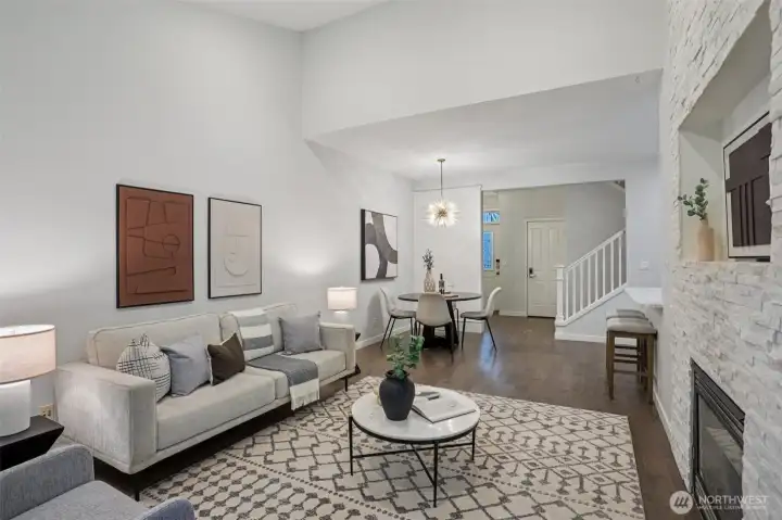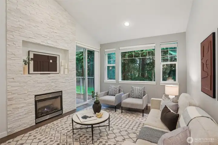 Nestled alongside a serene greenbelt, this beautifully reimagined Aspen Village townhome offers a rare blend of refined style and peaceful privacy. From the moment you enter, warm hardwood floors lead you through a bright and airy main level where thoughtful updates shine. The kitchen is a true centerpiece, featuring cool marble countertops, a custom-built peninsula, and stainless steel appliances including a gas stove and double oven—perfectly suited for both everyday use and entertaining. It opens seamlessly to a stunning Great Room, where vaulted ceilings create an impressive sense of space and a marble-tiled gas fireplace adds a touch of elegance. The adjoining dining area provides an inviting setting for gatherings or quiet evenings at home. Upstairs, two spacious bedrooms each offer their own private ensuite baths, including a primary suite with a soaking tub, dual sinks, and a custom walk-in closet. A versatile loft area adds flexibility for a reading nook, creative space, or home office, while the dedicated laundry room enhances convenience. Additional highlights include smart motion lighting and a two-car garage. Ideally located near local shops, dining, parks, and scenic trails, this home combines comfort, style, and access to the best of Snoqualmie Ridge living.