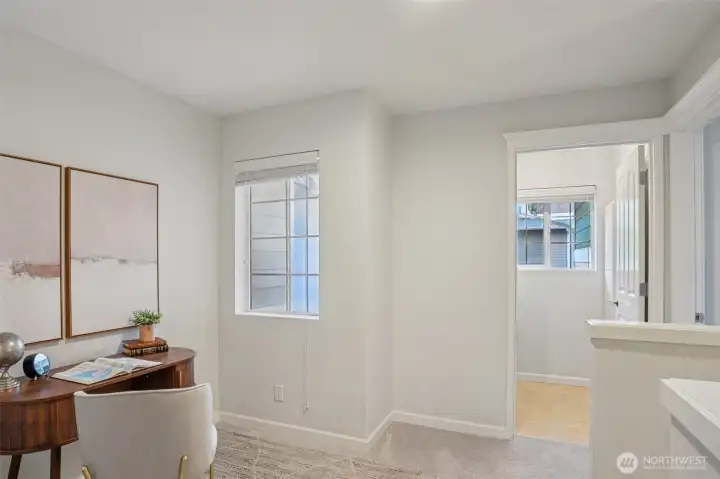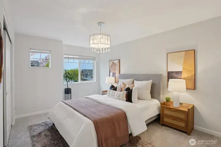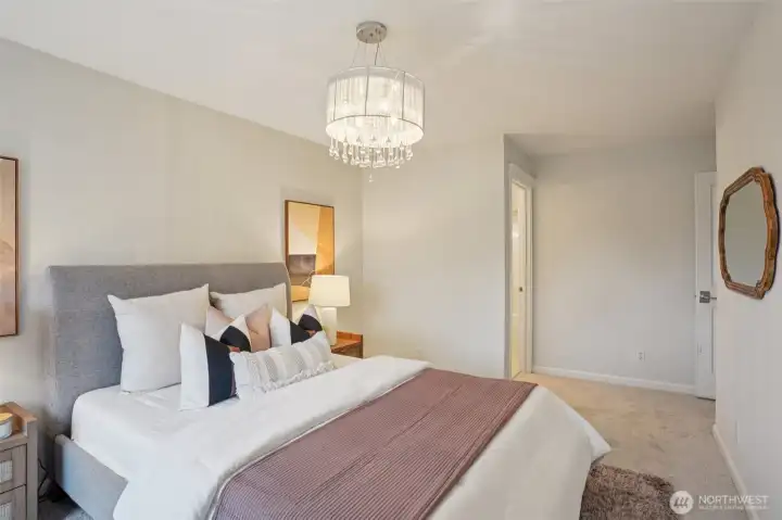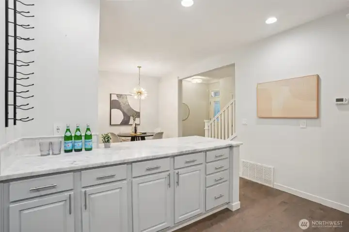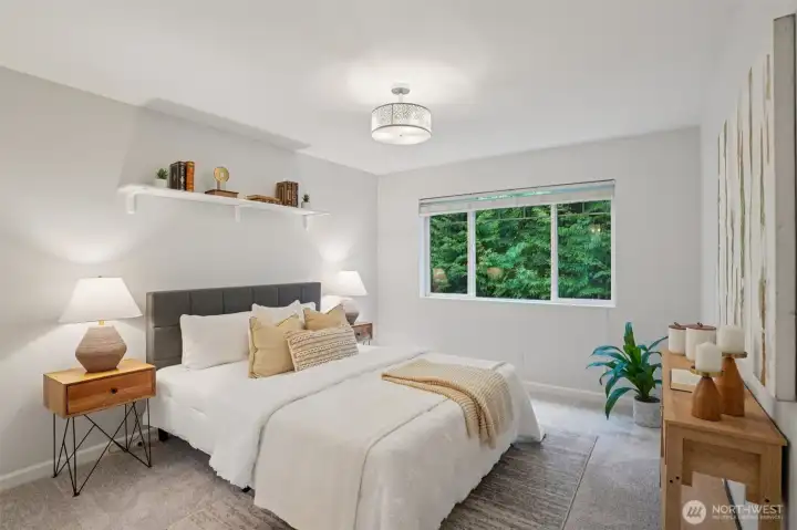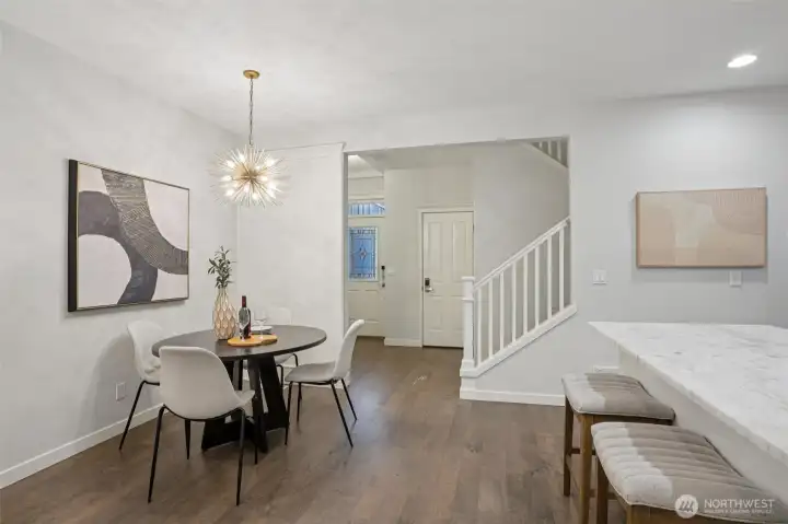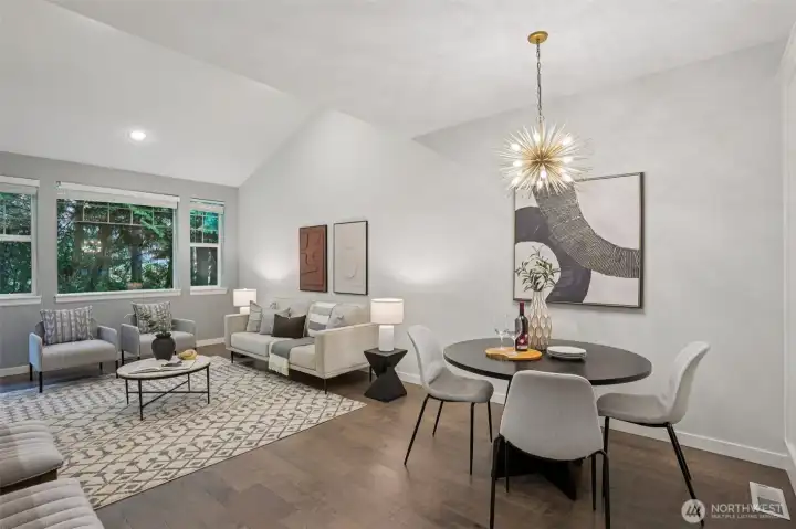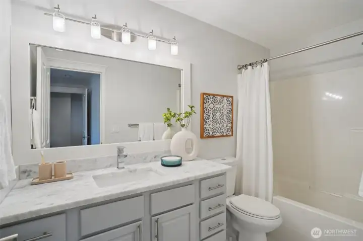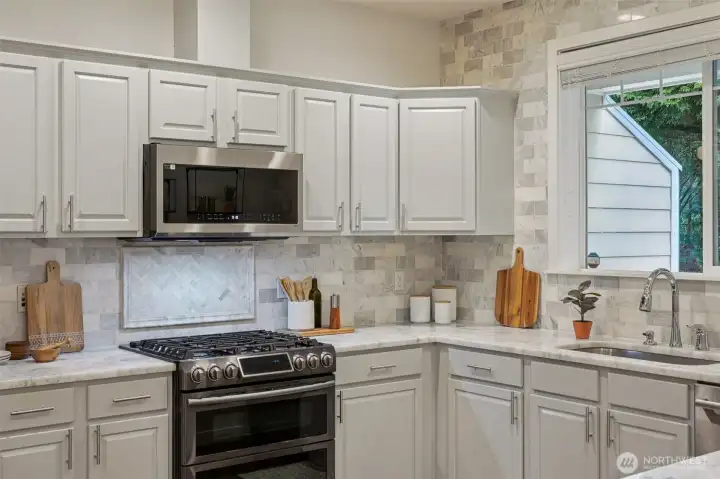 Nestled alongside a serene greenbelt, this beautifully reimagined Aspen Village townhome offers a rare blend of refined style and peaceful privacy. From the moment you enter, warm hardwood floors lead you through a bright and airy main level where thoughtful updates shine. The kitchen is a true centerpiece, featuring cool marble countertops, a custom-built peninsula, and stainless steel appliances including a gas stove and double oven—perfectly suited for both everyday use and entertaining. It opens seamlessly to a stunning Great Room, where vaulted ceilings create an impressive sense of space and a marble-tiled gas fireplace adds a touch of elegance. The adjoining dining area provides an inviting setting for gatherings or quiet evenings at home. Upstairs, two spacious bedrooms each offer their own private ensuite baths, including a primary suite with a soaking tub, dual sinks, and a custom walk-in closet. A versatile loft area adds flexibility for a reading nook, creative space, or home office, while the dedicated laundry room enhances convenience. Additional highlights include smart motion lighting and a two-car garage. Ideally located near local shops, dining, parks, and scenic trails, this home combines comfort, style, and access to the best of Snoqualmie Ridge living.