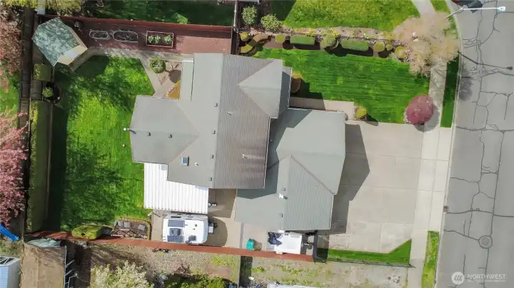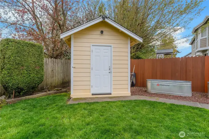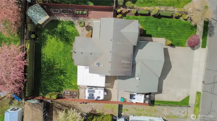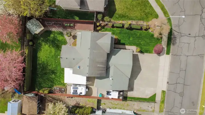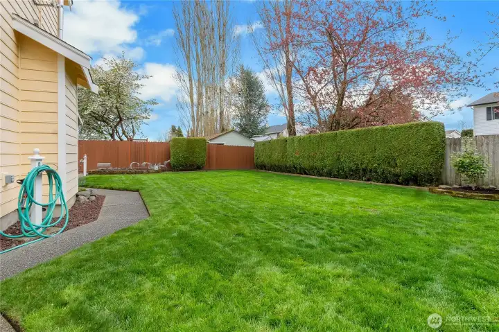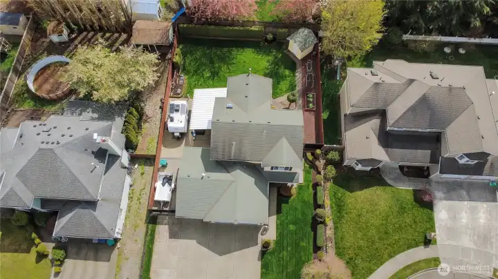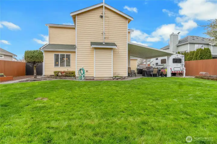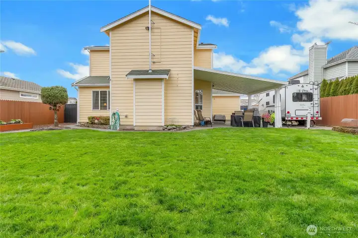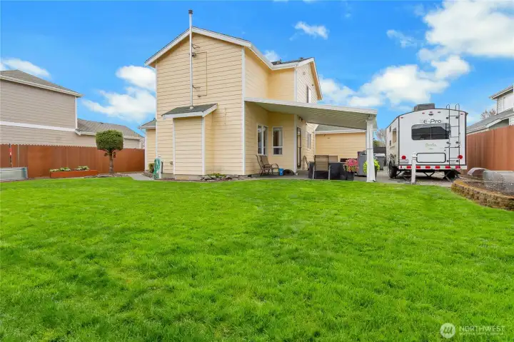 Fully fenced yard with wired RV space and covered patio.