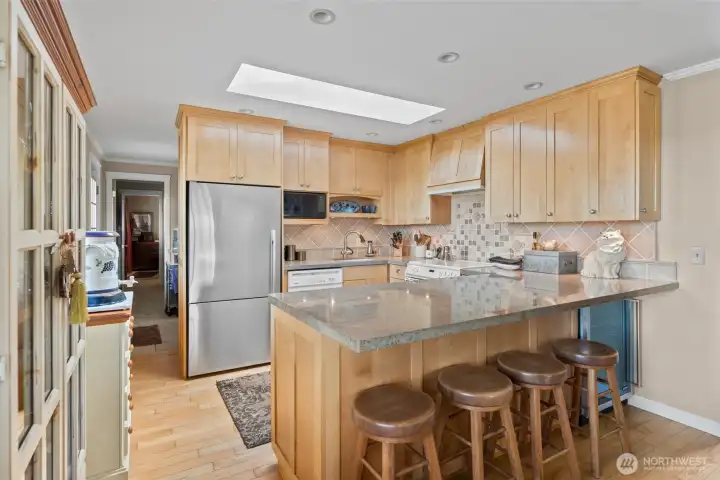 Thoughtfully redone kitchen with bar, wine fridge, custom cabinets, granite countertops, and newer SS appliances.