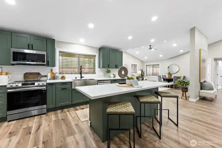 Carefully thought out design allows for large kitchen connected to but separate from the living areas. Vaulted ceilings add loft and lightness to the space.