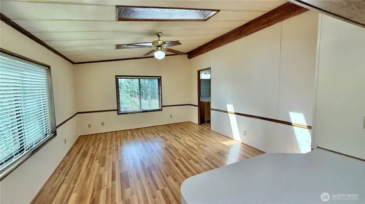 Need space? This one delivers. Spacious 3-bed home with big rooms, vaulted ceilings, and an open floor plan that gives the home an even larger feel. Fresh interior paint, new carpet, LVP and laminate flooring, and LED lighting give it a clean, updated look. The large kitchen offers a breakfast bar, generous counter space, and tons of cabinets. Wood-burning fireplace in the living room adds a cozy touch. The primary bathroom has been fully updated and includes double sinks. All appliances stay. Newer roof, newer furnace, some newer windows, vinyl siding, huge 2-car carport, 3 sheds, ramp entry, and excellent storage complete the package in a quiet 55+ community with appealing space rent.