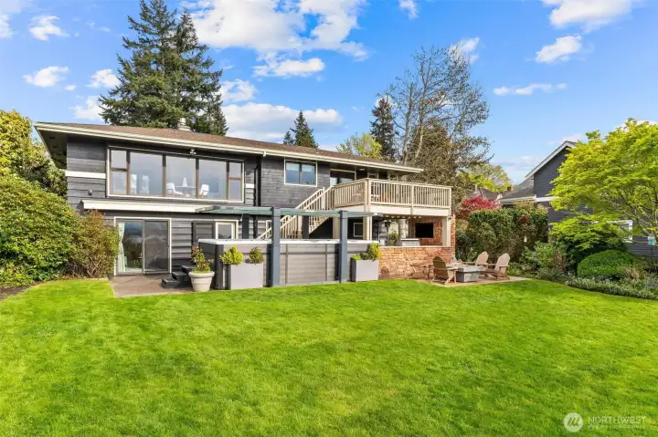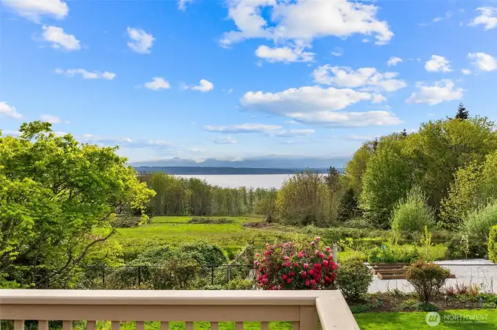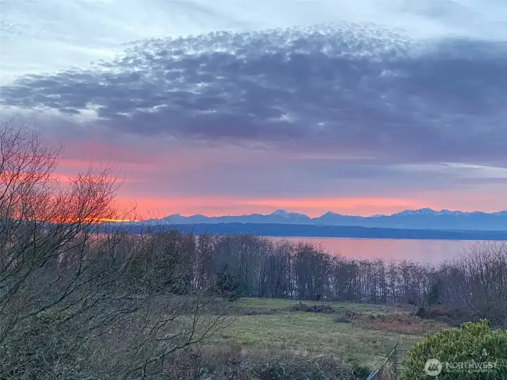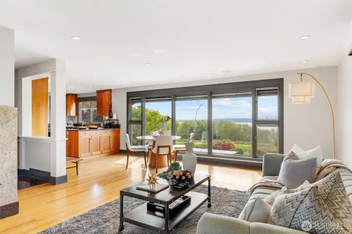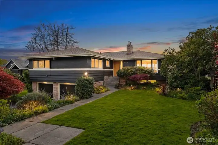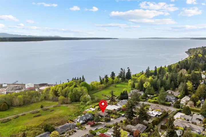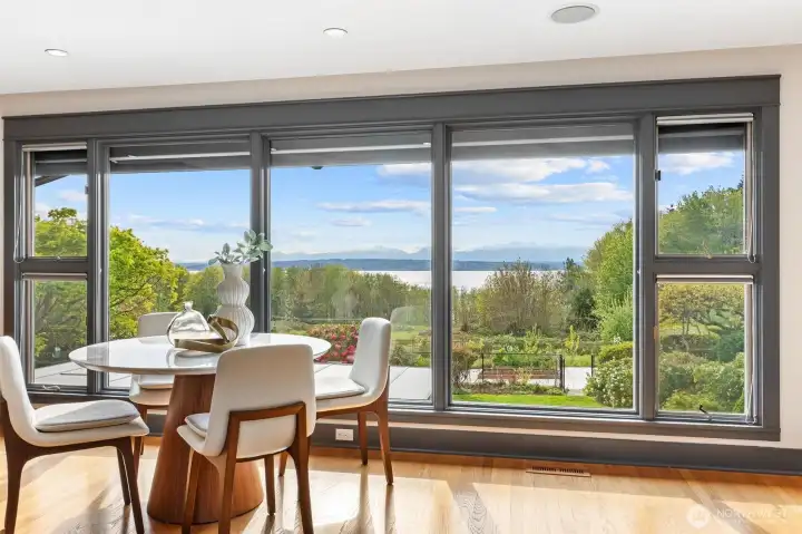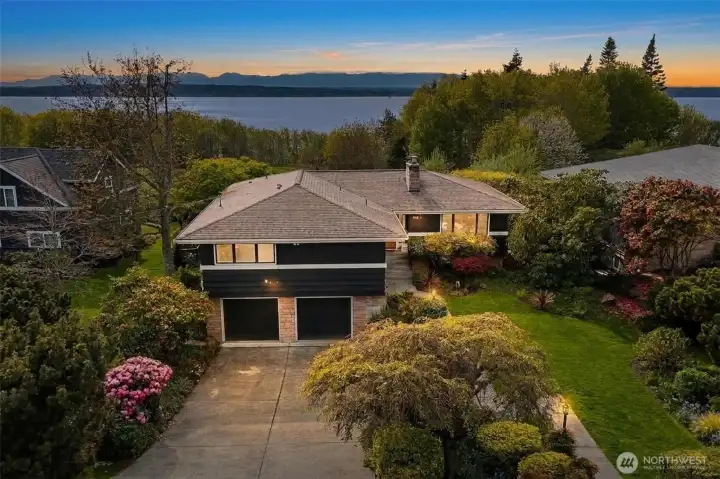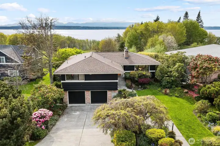 Absolutely spectacular Puget Sound and Olympic Mountain views take center stage in this timeless mid-century home, set in the peaceful Woodway community. Expansive floor-to-ceiling windows bathe the main living and dining areas in natural light, showcasing rich hardwood floors and creating a bright, welcoming atmosphere.The open kitchen features custom cabinetry, granite counters, stainless appliances, slate flooring, and a cozy eating nook. The main-level primary suite connects to a flexible adjoining room—ideal for an office or sitting area—along with a beautifully updated spa like bath featuring heated floors and a custom limestone shower, all with a view. A second bedroom and 1/2 bath complete the main level.The daylight lower level expands the home’s livability with a generous family room centered around a gas fireplace, along with a bedroom and bathroom—perfect for guests or multi-generational living.Outside, enjoy a truly special setting with established fruit trees and thriving berries, complemented by a covered swim spa for year-round enjoyment. All are set within a thoughtfully designed, easy-care garden originally created by John Guenther—known for his passion for gardening and his professional bowling career—adding a unique sense of history and charm. A rare blend of view, character, and lifestyle.