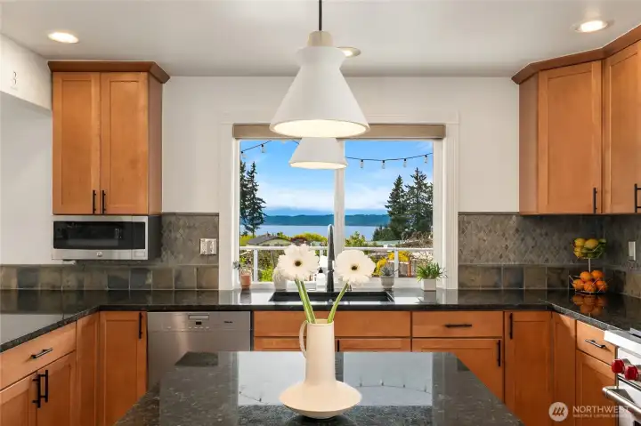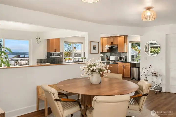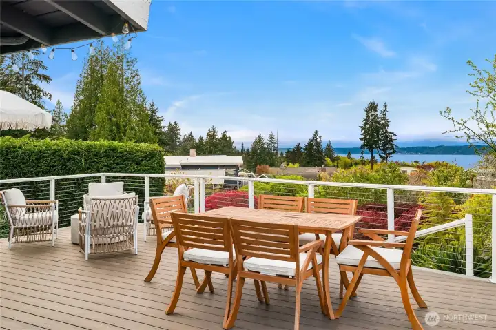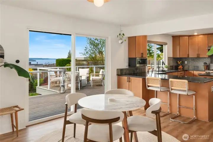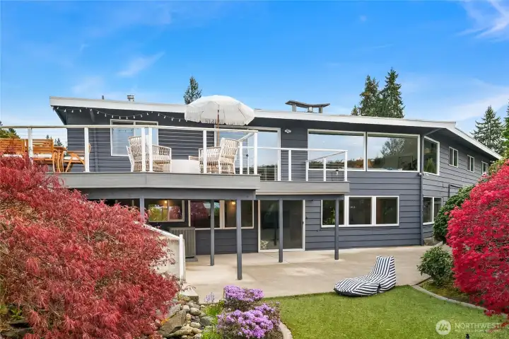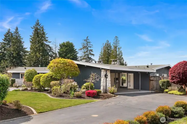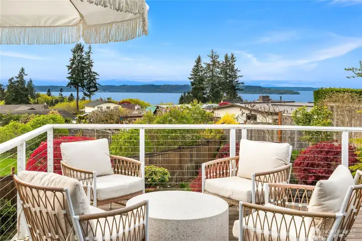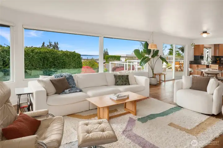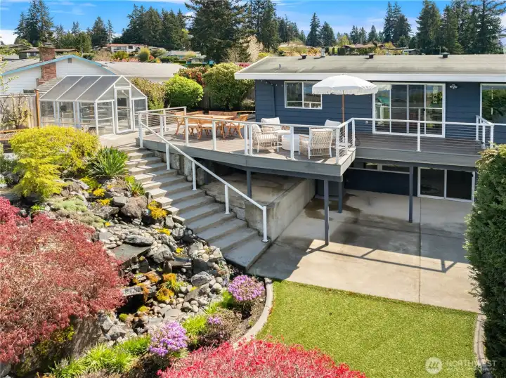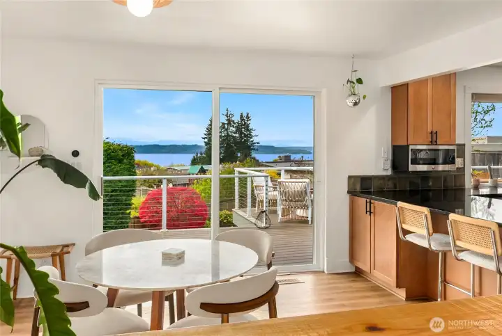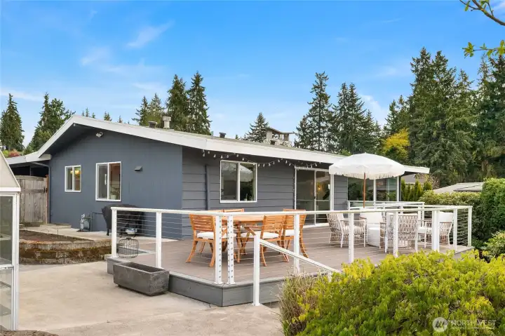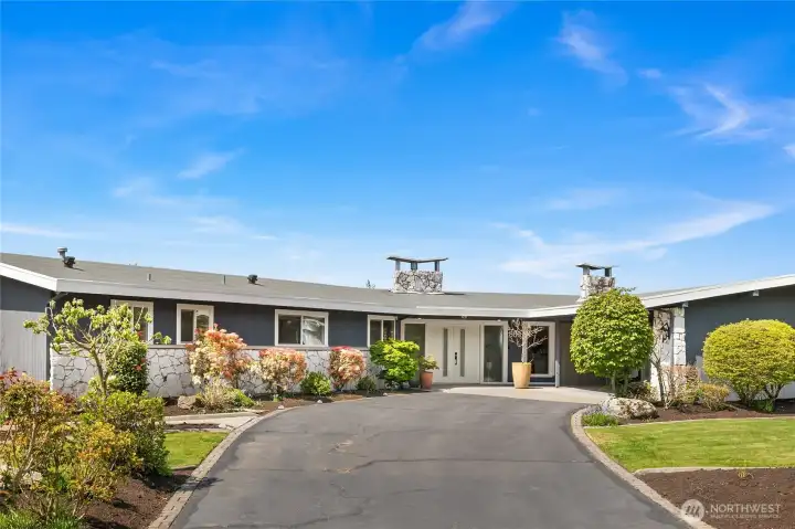 A true mid-century modern retreat, thoughtfully updated and quietly set on a private view-lot in Marine Hills. This light-filled, level-entry home blends clean design with natural beauty, offering sweeping Puget Sound and Olympic Mountain views from nearly every angle. The heart of the home is an open-concept living space and expansive, chef's kitchen with contemporary finishes, Wolf range, & seamless access to the view deck & patio—ideal for everyday living & effortless entertaining. Spot wildlife & ships passing through the channel, & unforgettable sunsets from your own backyard. The serene primary suite is reimagined with a spa-inspired en suite bathroom complete with freestanding soaking tub, walk-in shower, and refined finishes. Lush, curated landscaping surrounds the home, highlighted by a tranquil rock waterfall, fully fenced yard, greenhouse & planting beds. A composite deck with powder-coated stainless cable railing system provides the perfect perch for relaxation. The lower level offers exceptional flexibility: separate entrance, kitchenette, & direct access to patios & walkways—ideal for guests or multi-gen living. Dual-zone HVAC, 2 water heaters, loop driveway, ample parking, & neighborhood pool, pickle-ball courts & buried power lines, add everyday convenience. Located just minutes from Redondo Beach, Des Moines Marina, Saltwater State Park, & shopping. A rare opportunity to own a private, view-driven home with timeless design & modern livability in Marine Hills.