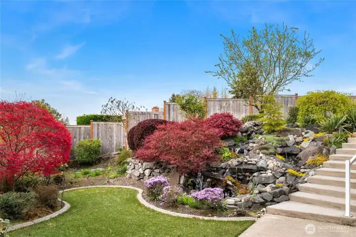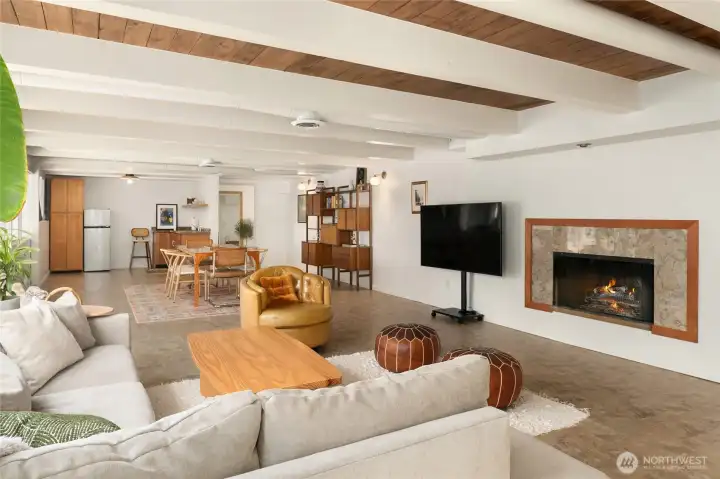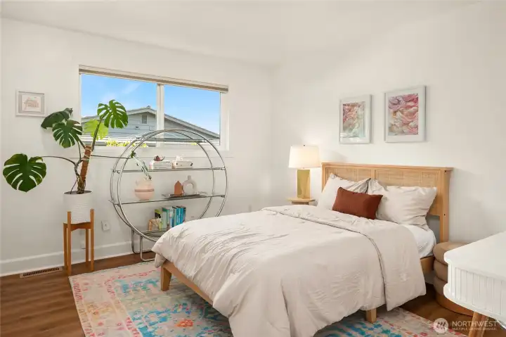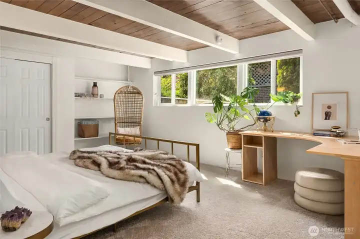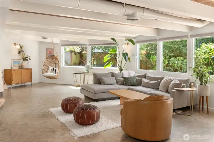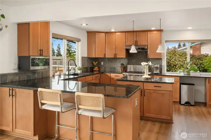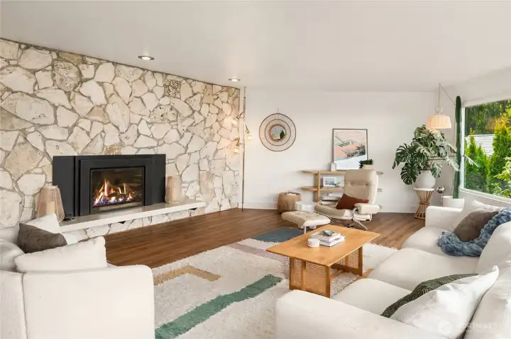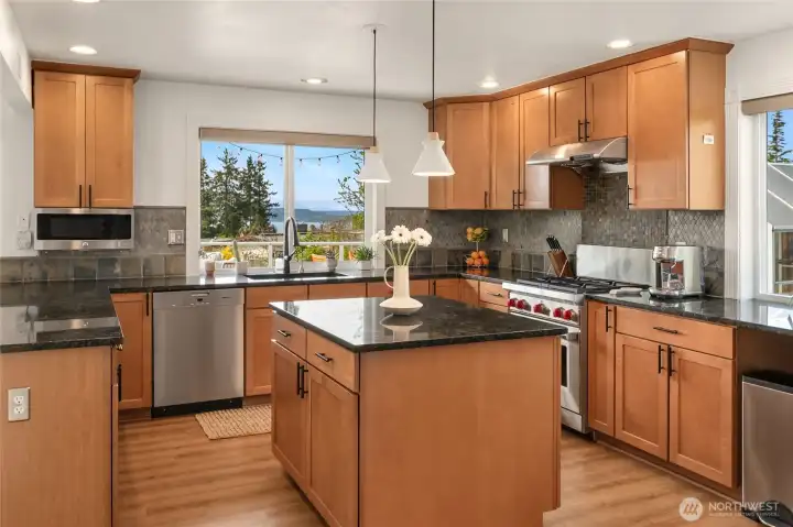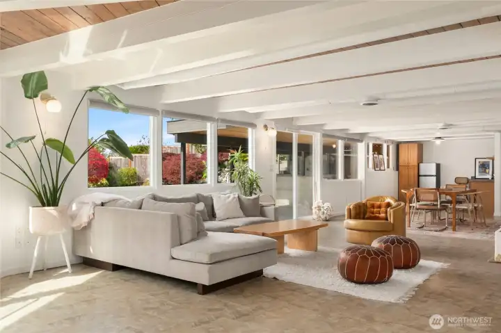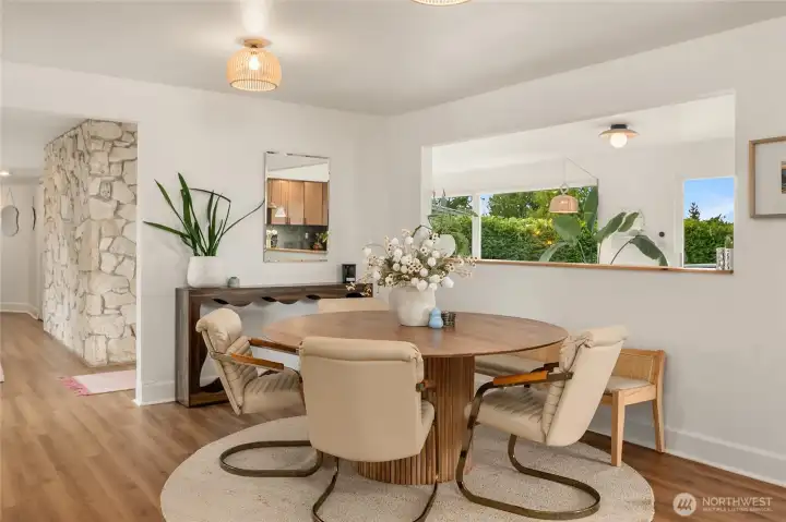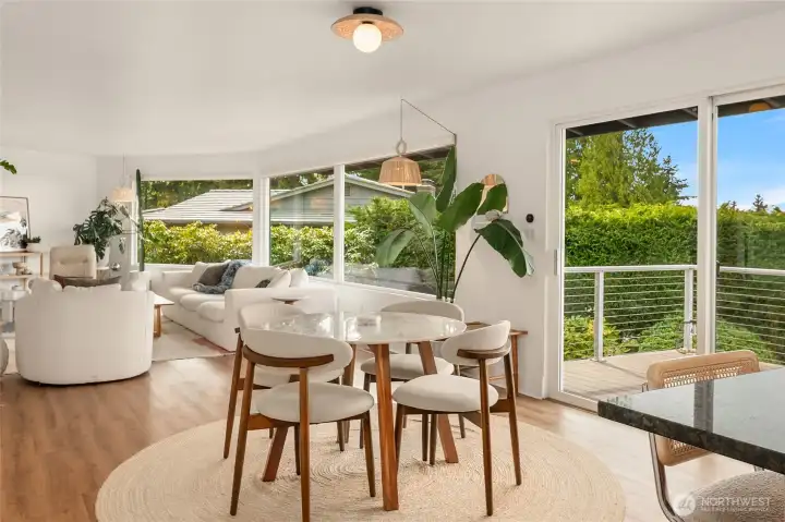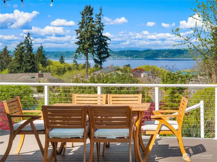 A true mid-century modern retreat, thoughtfully updated and quietly set on a private view-lot in Marine Hills. This light-filled, level-entry home blends clean design with natural beauty, offering sweeping Puget Sound and Olympic Mountain views from nearly every angle. The heart of the home is an open-concept living space and expansive, chef's kitchen with contemporary finishes, Wolf range, & seamless access to the view deck & patio—ideal for everyday living & effortless entertaining. Spot wildlife & ships passing through the channel, & unforgettable sunsets from your own backyard. The serene primary suite is reimagined with a spa-inspired en suite bathroom complete with freestanding soaking tub, walk-in shower, and refined finishes. Lush, curated landscaping surrounds the home, highlighted by a tranquil rock waterfall, fully fenced yard, greenhouse & planting beds. A composite deck with powder-coated stainless cable railing system provides the perfect perch for relaxation. The lower level offers exceptional flexibility: separate entrance, kitchenette, & direct access to patios & walkways—ideal for guests or multi-gen living. Dual-zone HVAC, 2 water heaters, loop driveway, ample parking, & neighborhood pool, pickle-ball courts & buried power lines, add everyday convenience. Located just minutes from Redondo Beach, Des Moines Marina, Saltwater State Park, & shopping. A rare opportunity to own a private, view-driven home with timeless design & modern livability in Marine Hills.