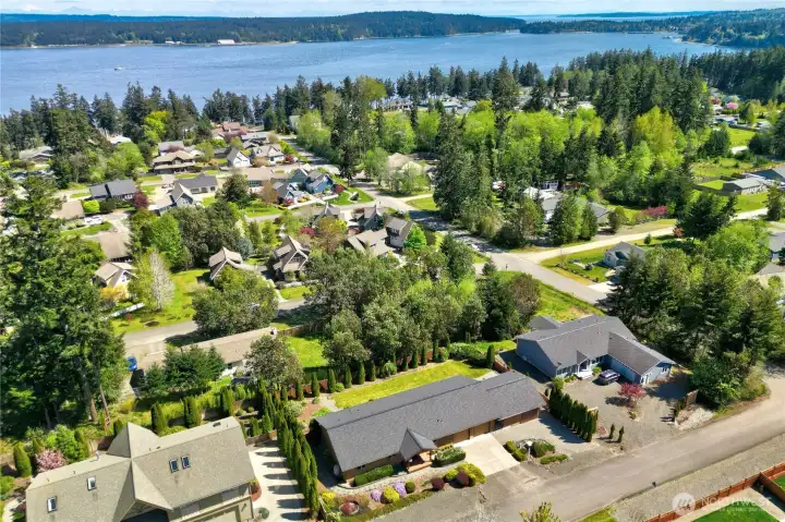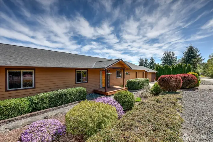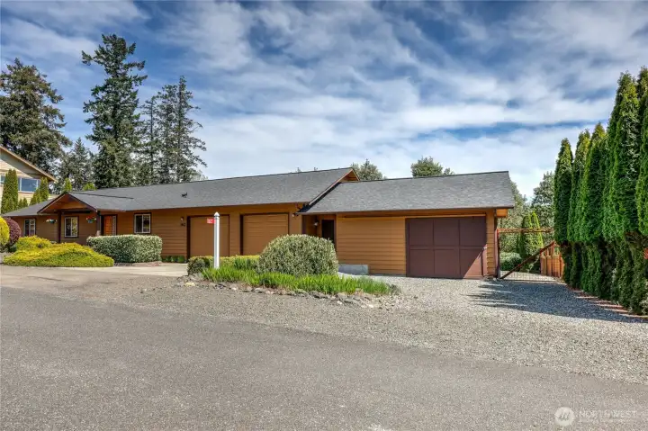 The home has an attached two car garage plus an addition which houses a studio and an additional garage bay