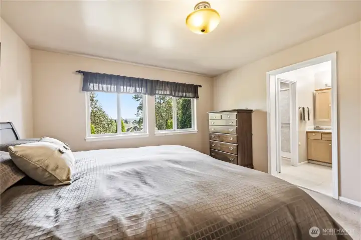 Primary bedroom faces the verdant back yard.