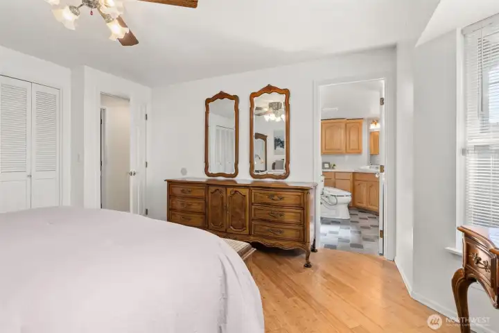 The newer flooring extends into the bedrooms. Fan and bay window are nice touches.