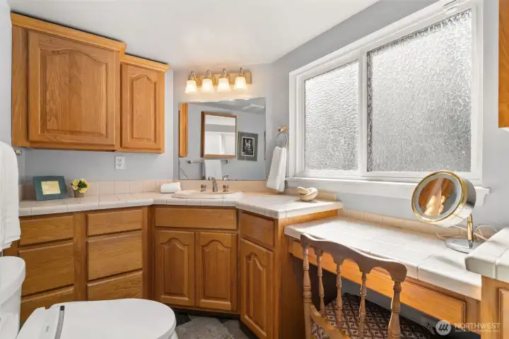 Vanity area with the natural light allows for much counter space and a great space to get ready