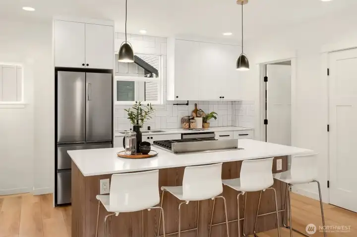 Set in the heart of Maple Leaf, this fully updated home blends classic Seattle character with a clean, modern finish. Thoughtfully remodeled throughout, it features custom cabinetry, designer tile and high-end fixtures, centered around a chef’s kitchen with a premium gas range, designed for both everyday living and entertaining. The main level is bright and inviting, with great natural light, an easy flow and functional built-ins. Downstairs features a spacious flex area with its own mini kitchen, offering ideal separation for a home office, gym, media room, or bonus living space, along with ample storage to keep things organized. Outside, enjoy a manageable yard with space to relax, garden, or host, all while maintaining a sense of privacy. Just minutes to parks, playfields, walking trails and neighborhood favorites, with easy access to I-5 for a smooth commute. Turnkey, well-designed and versatile, this is the kind of Maple Leaf home buyers have been waiting for.