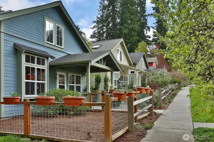 Over looking the common lawn and sidewalk. There is a community space at in the upper left of photo for gathering. A covered pavillion!