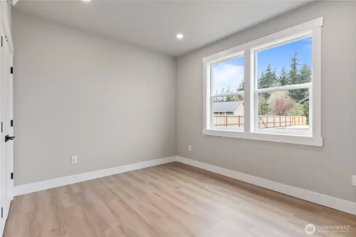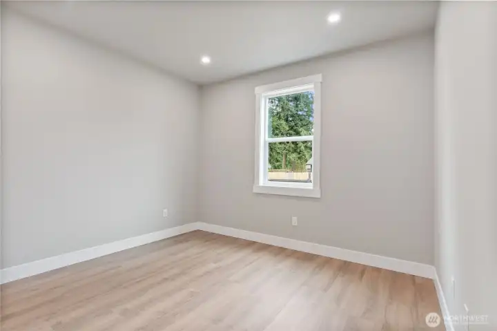 Living room with electric fireplace, built-in shelving, and LVP flooring