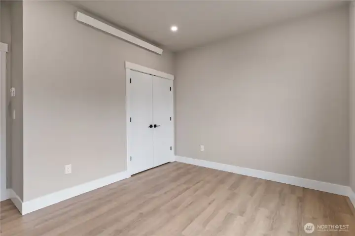 Three-car garage interior — finished with LED strip lighting and clean concrete floor