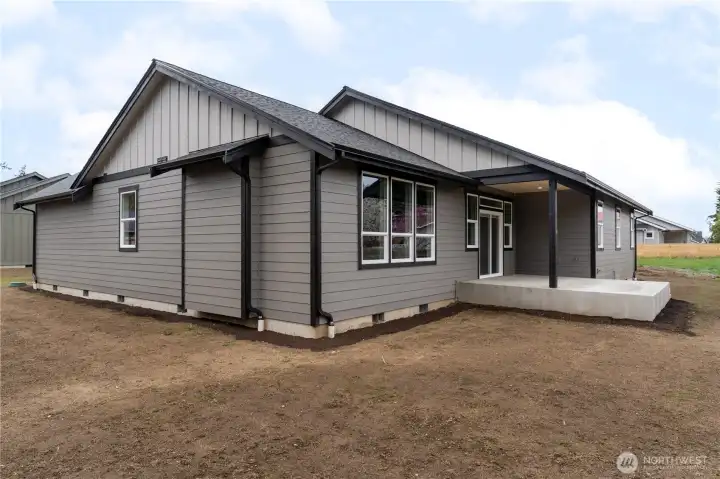 Modern farmhouse curb appeal with board and batten siding and oversized concrete driveway
