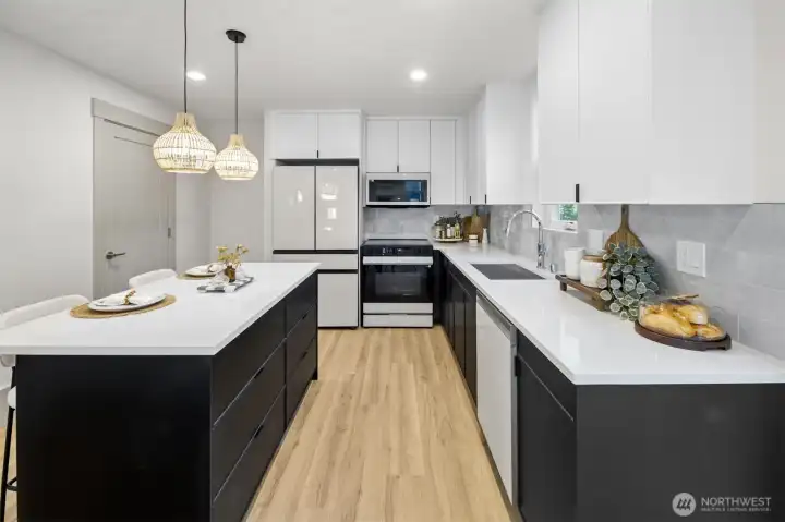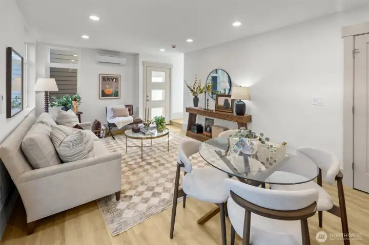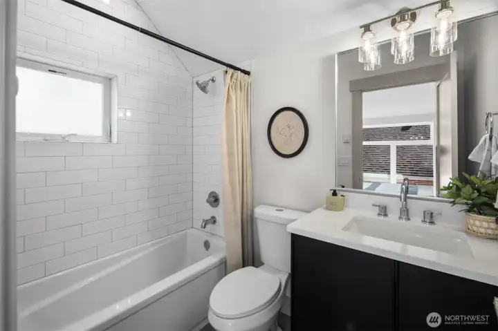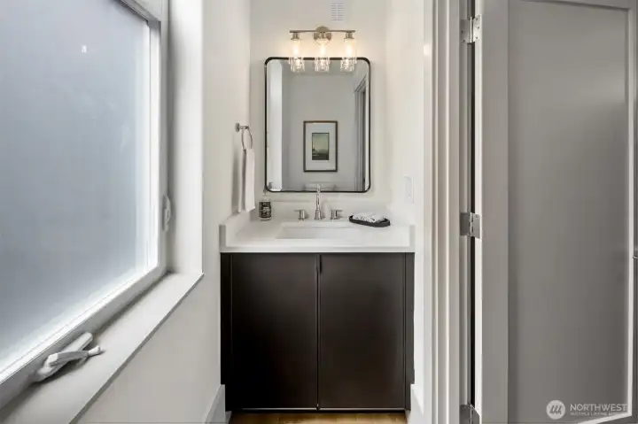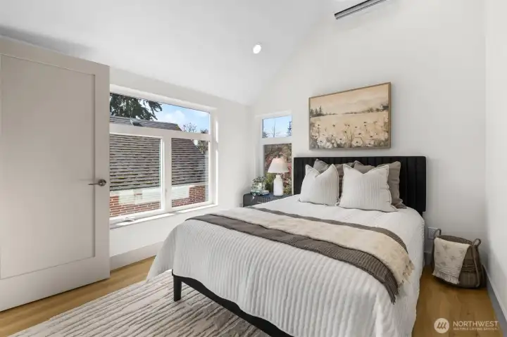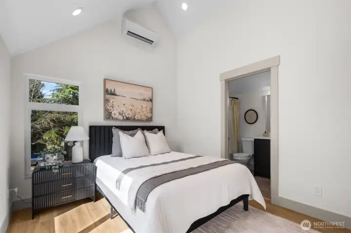 Quality construction meets intentional design in this brand-new stand-alone cottage by Accessory Dwellings, nestled in the highly desirable Belvidere neighborhood of West Seattle. The open-concept main floor delivers from the moment you walk in, with flat-panel cabinetry, a clean-lined island with quartz counters, stainless appliances, and warm luxury vinyl plank floors throughout. A powder room off the kitchen and sliding door to a private yard add seamless convenience. Upstairs, both bedrooms enjoy their own ensuite bathrooms. The primary suite features a walk-in closet and a spa-worthy bath with dual sinks, quartz counters, and a frameless glass shower. Radiant heated floors in the primary bath add a welcome touch of luxury. The spacious secondary bedroom is equally well-appointed with its own private bath. Dedicated off-street EV-ready parking completes the package. The location is a genuine West Seattle gem. Lady Jaye, Little Donkey, and the beloved Met Market are all just minutes away, with Belvedere Park offering sweeping views of the Seattle skyline and Elliott Bay, and Alki Beach just down the hill. This is West Seattle living at its best.