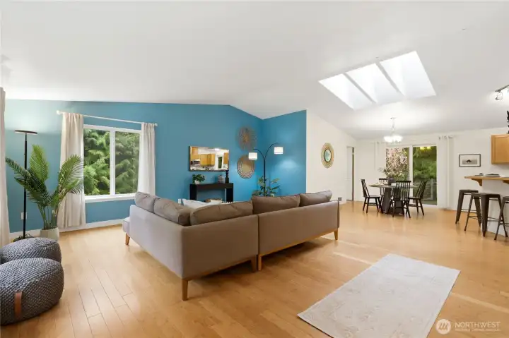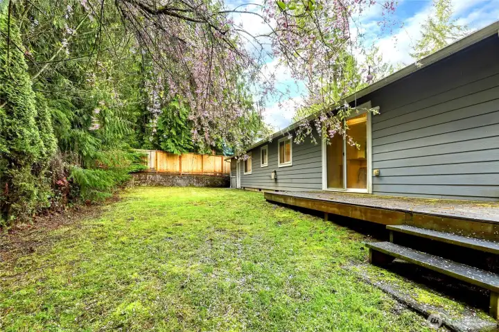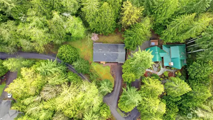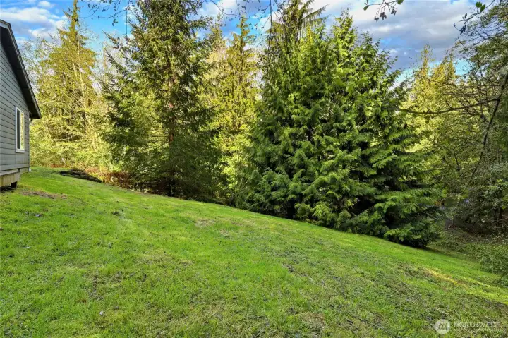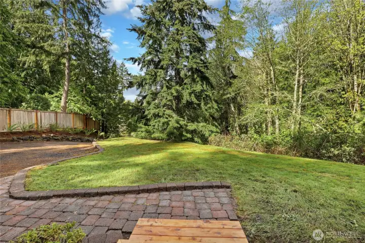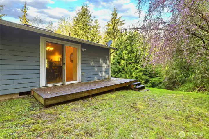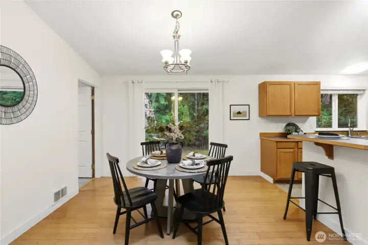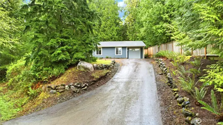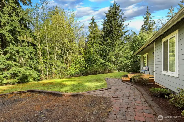 Quiet and welcoming rambler nestled among evergreens, where birdsong and serenity surround you. This charming 3-bedroom, 2-bath home is perched above the street, offering privacy and a peaceful setting accessed by a slightly steep driveway. Enjoy beautiful west-facing sunsets filtering through the trees and unwind in the shaded backyard on warm summer days. Inside, bamboo flooring flows through the great room, kitchen, dining area, and primary closet, adding warmth and continuity to the open living spaces. The spacious primary suite features a walk-in closet with custom organizer and a thoughtfully designed layout. The open-concept kitchen offers abundant counter space, ample cabinetry, and a lovely view of the backyard—perfect for both everyday living and entertaining. Sliding glass doors off the dining area lead to your private, wooded retreat, ideal for relaxing or hosting gatherings. Situated on 2.5+ acres, this property provides the best of quiet country living while remaining just minutes from the amenities, shopping, and dining of Silverdale and Poulsbo.