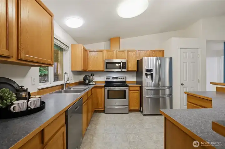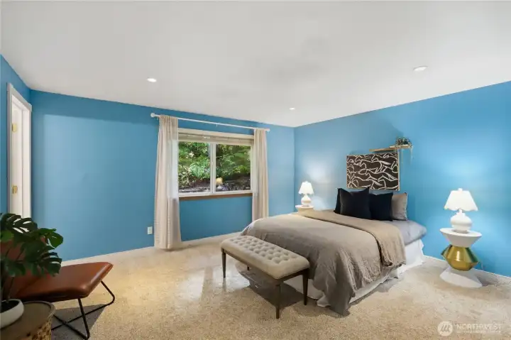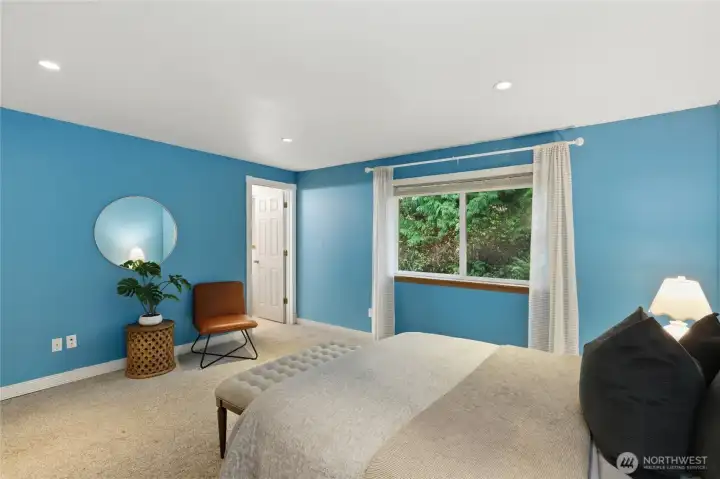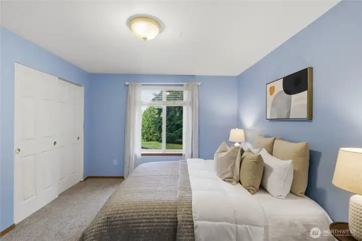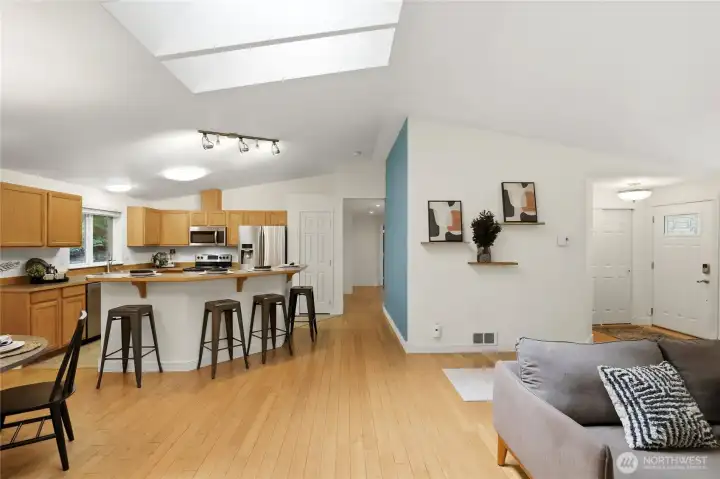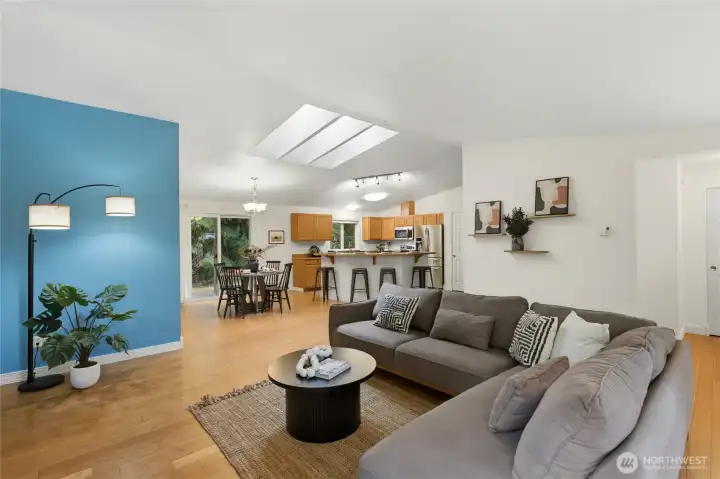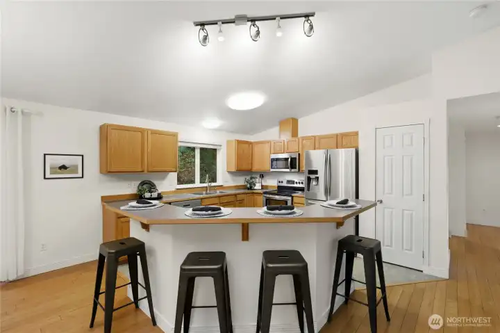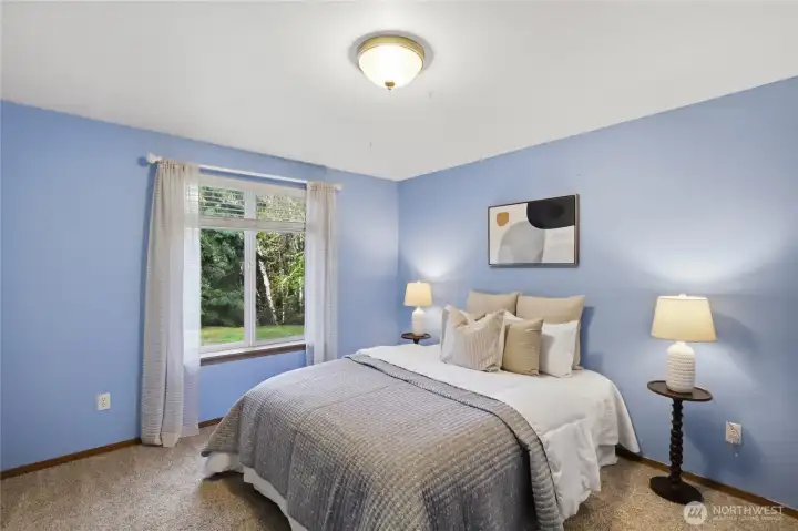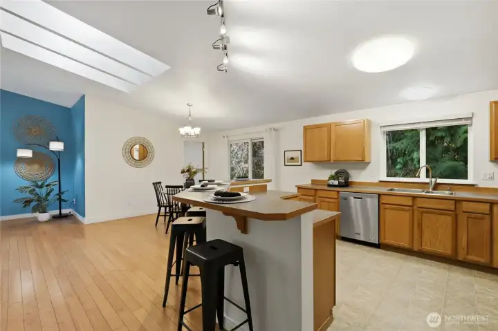 Quiet and welcoming rambler nestled among evergreens, where birdsong and serenity surround you. This charming 3-bedroom, 2-bath home is perched above the street, offering privacy and a peaceful setting accessed by a slightly steep driveway. Enjoy beautiful west-facing sunsets filtering through the trees and unwind in the shaded backyard on warm summer days. Inside, bamboo flooring flows through the great room, kitchen, dining area, and primary closet, adding warmth and continuity to the open living spaces. The spacious primary suite features a walk-in closet with custom organizer and a thoughtfully designed layout. The open-concept kitchen offers abundant counter space, ample cabinetry, and a lovely view of the backyard—perfect for both everyday living and entertaining. Sliding glass doors off the dining area lead to your private, wooded retreat, ideal for relaxing or hosting gatherings. Situated on 2.5+ acres, this property provides the best of quiet country living while remaining just minutes from the amenities, shopping, and dining of Silverdale and Poulsbo.