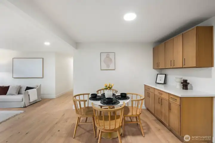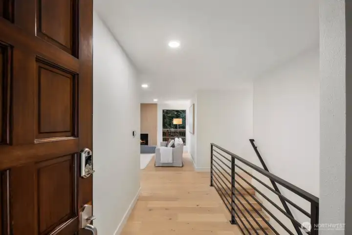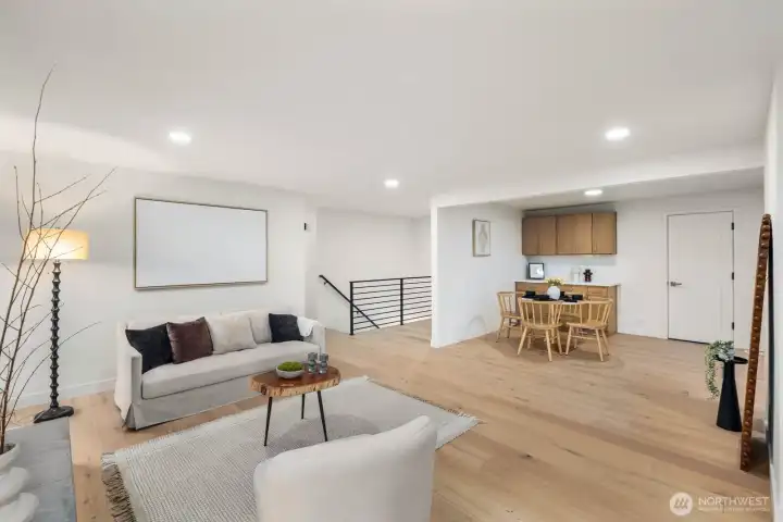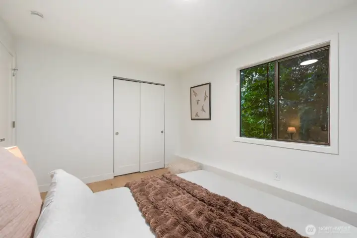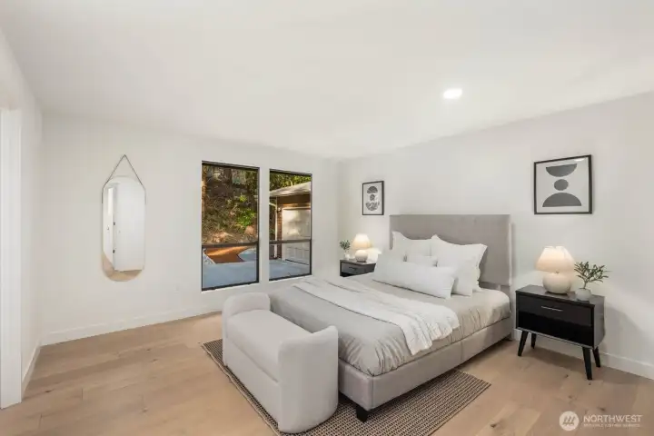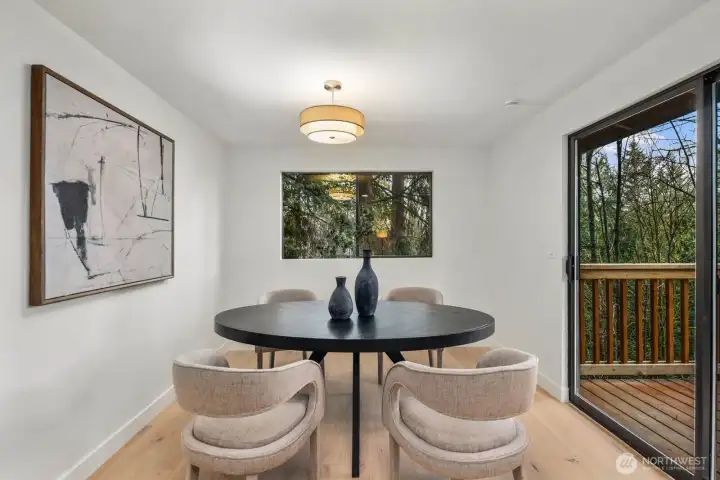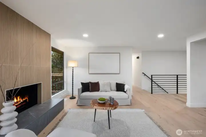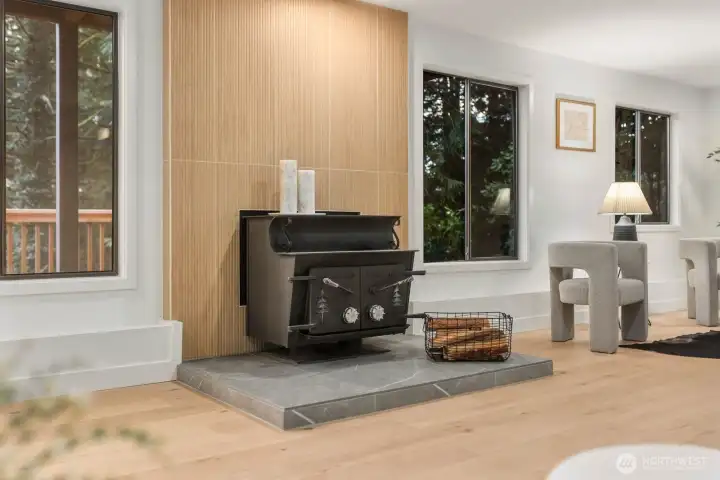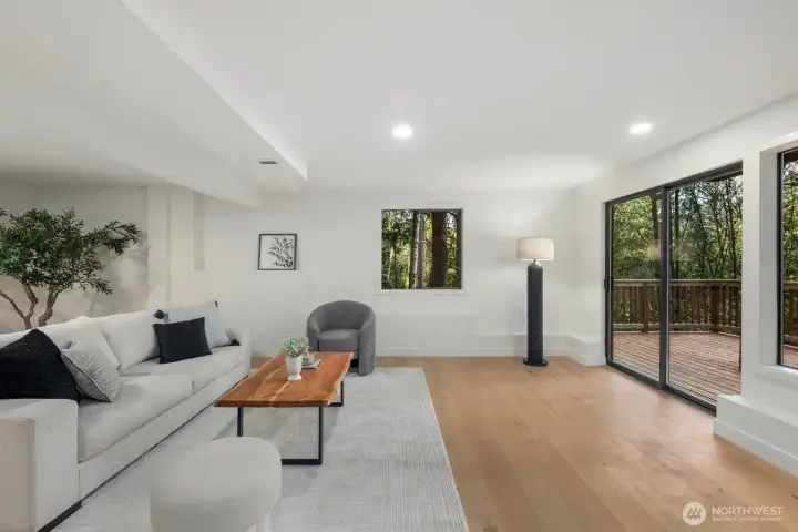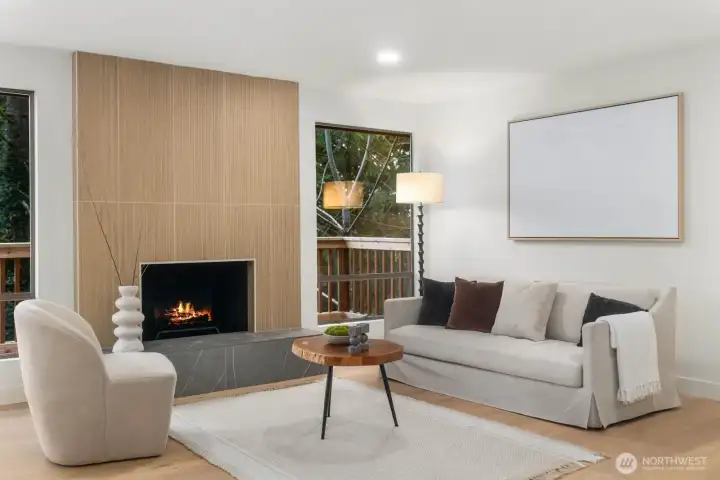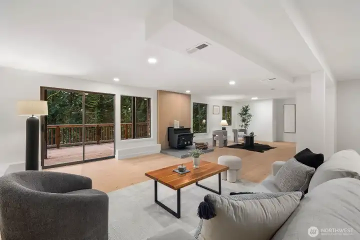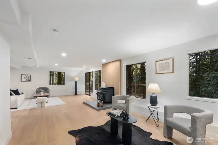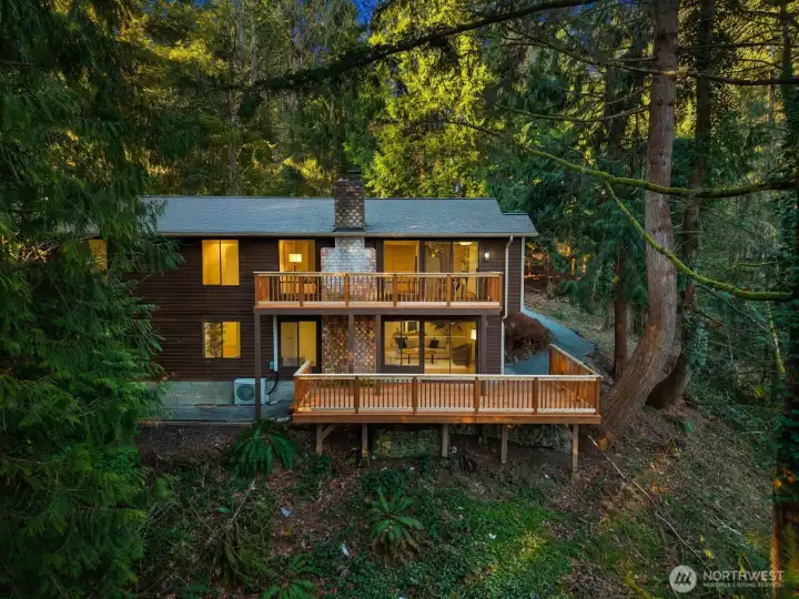 Nestled in the coveted Mirrormont neighborhood, this beautifully remodeled 4-bedroom, 3-bathroom home offers nearly 3,000 square feet of refined living surrounded by the natural beauty of the Pacific Northwest. Set on just under an acre of forested land, the property delivers a rare sense of seclusion while remaining close to everything Issaquah has to offer. Engineered hardwood floors flow throughout the open living spaces, anchored by a stunning wood-paneled fireplace with a dark stone hearth and floor-to-ceiling surround. Walls of windows and sliding glass doors connect the living room directly to the deck, where towering evergreens and peaceful forest views set the backdrop. The updated kitchen features warm wood cabinetry, stainless appliances, and clean white countertops opening to a casual dining area. The primary suite is a genuine retreat, complete with a custom walk-in closet finished with built-in shelving and drawers. The lower level adds a spacious second living area with its own fireplace, offering flexibility for a media room, guest quarters, or additional entertaining space. Multiple decks, a two-car garage, and nearly an acre of forested grounds complete this move-in ready offering in one of Mirrormont’s most sought-after settings.